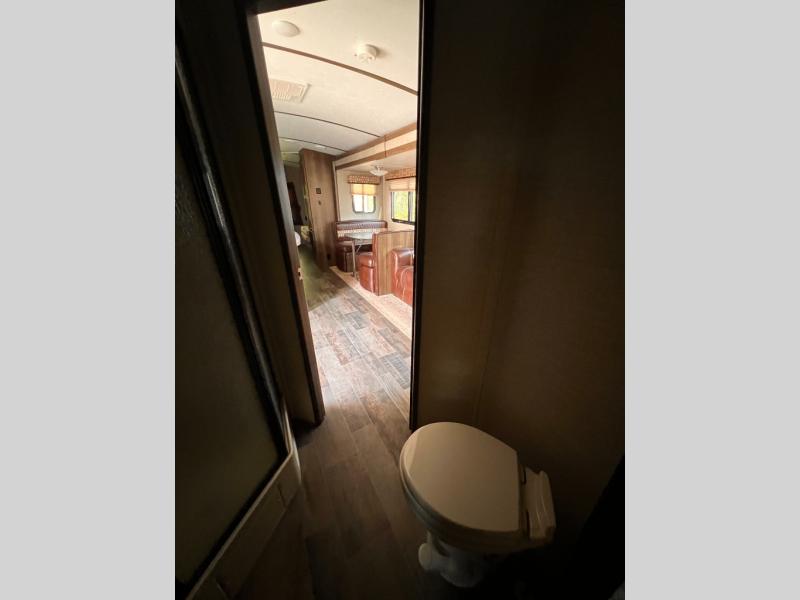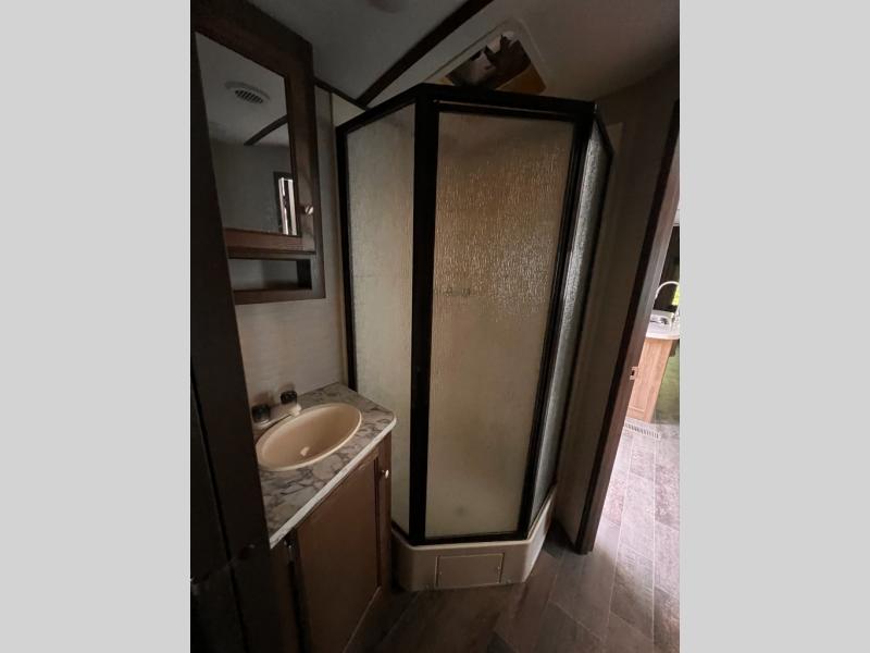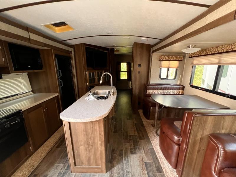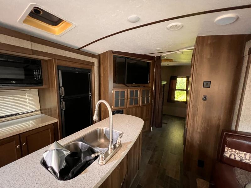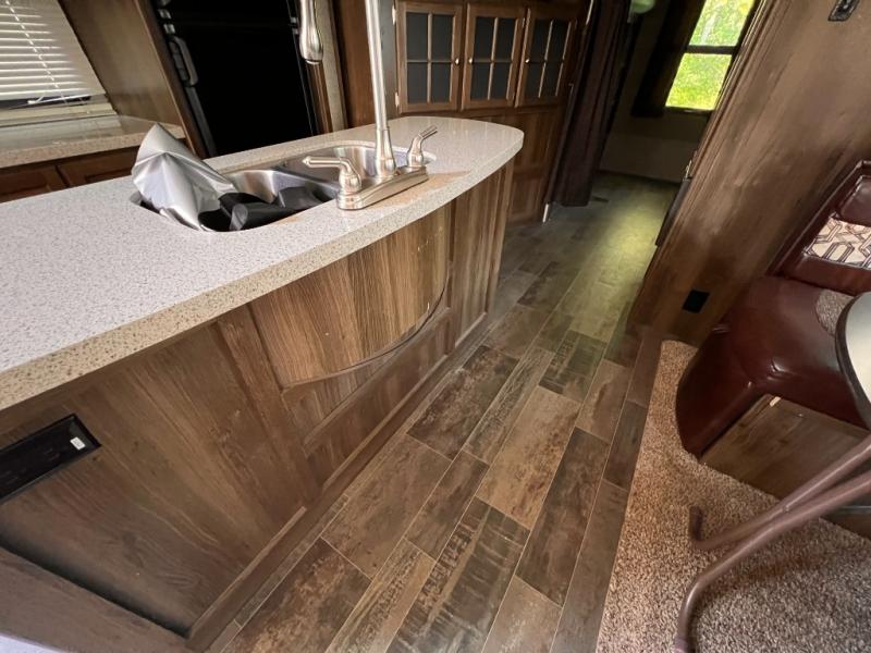 Step inside to see a spacious home like atmosphere including triple slide outs that really open up the space. The kitchen and living area are combined and feature slides opposite one another. There is a center island with dual kitchen sinks for your convenience.