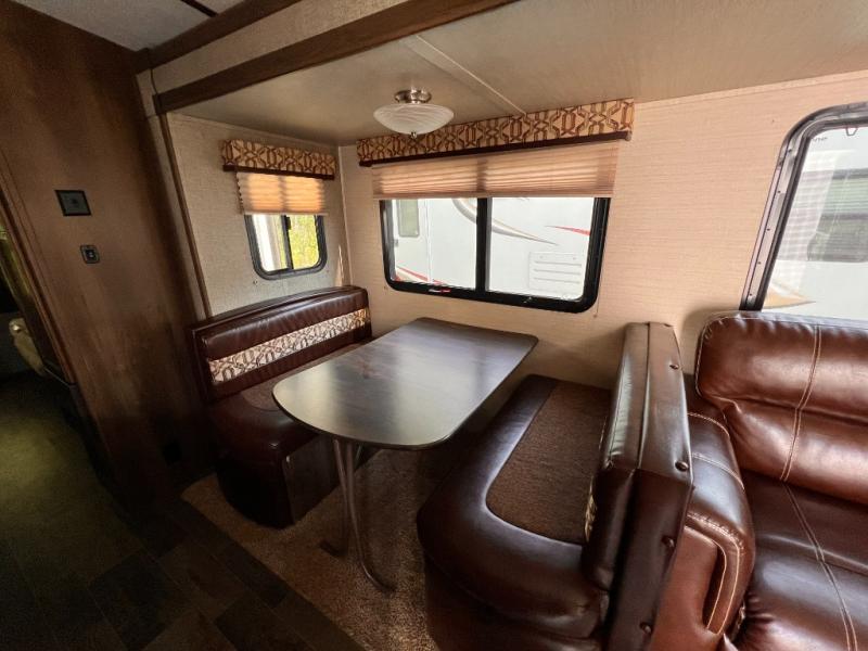 The slide opposite the entry door features a tri-fold sofa with overhead storage and a booth dinette that is perfect for meal times and more. There is small pantry located just off the booth dinette and a large pantry across the unit next to the kitchen slide. The kitchen slide features a refrigerator, counter space plus storage, and a three burner range for cooking.