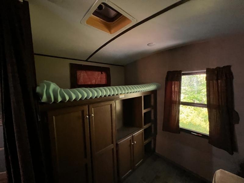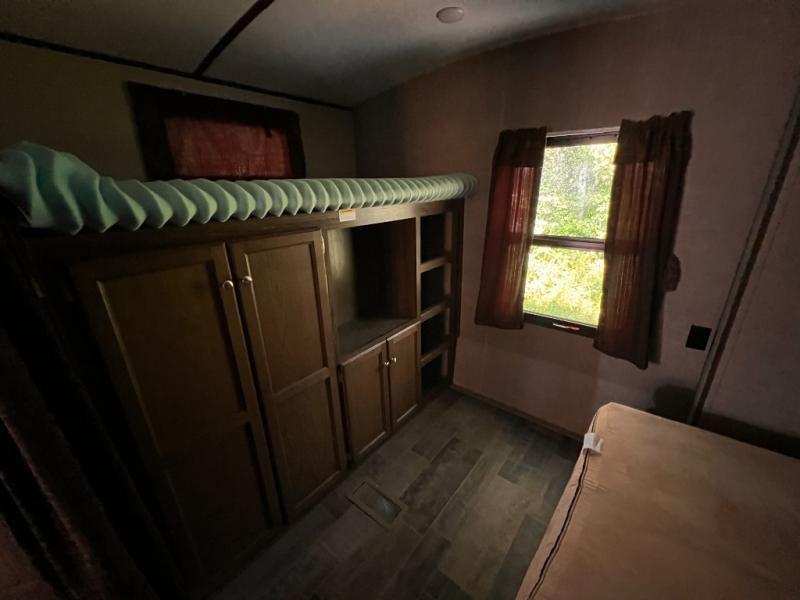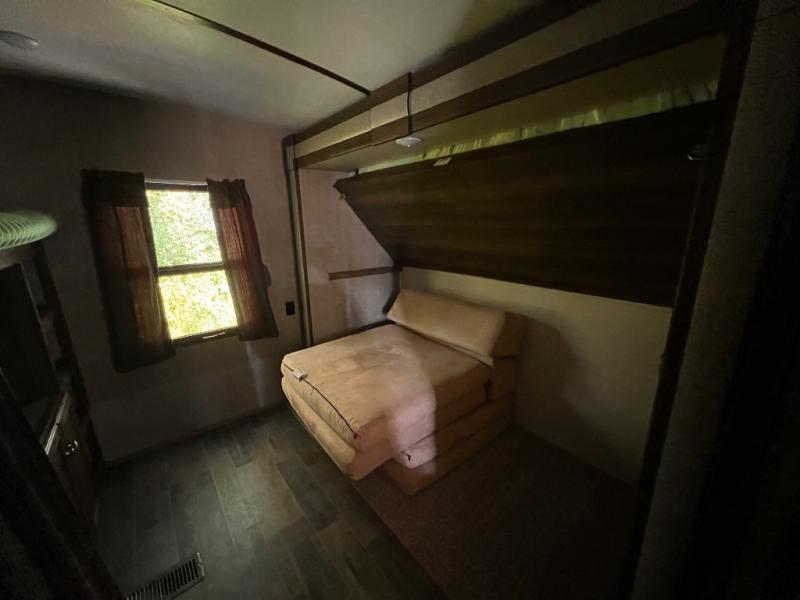 The rear bunkhouse will be a favorite room for the kids, or the perfect space for extra guests to have a private retreat of their own. There is a futon slide with 32" x 74" flip bunk above on one side, and a 32" x 74" bunk above a wardrobe opposite with a ladder to the top bunk.