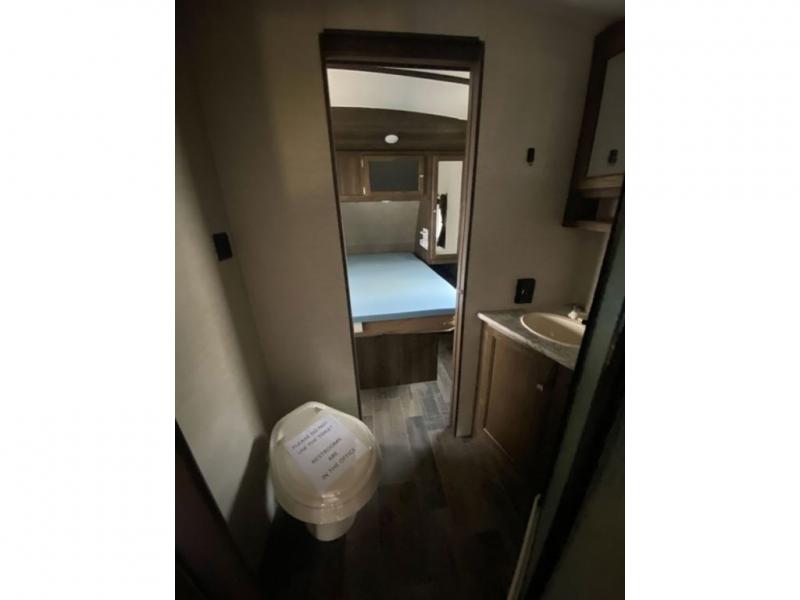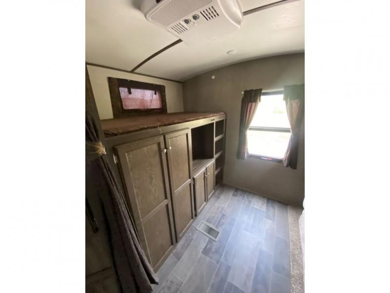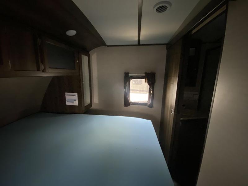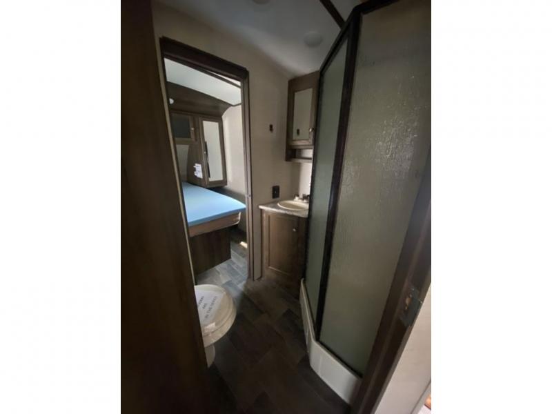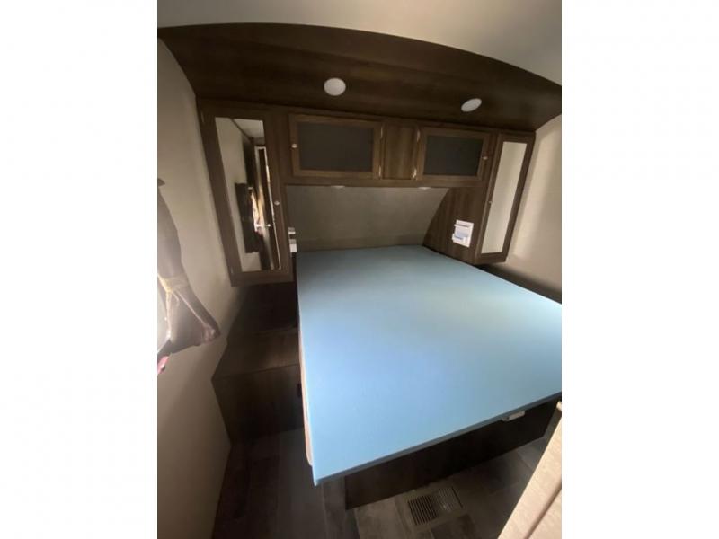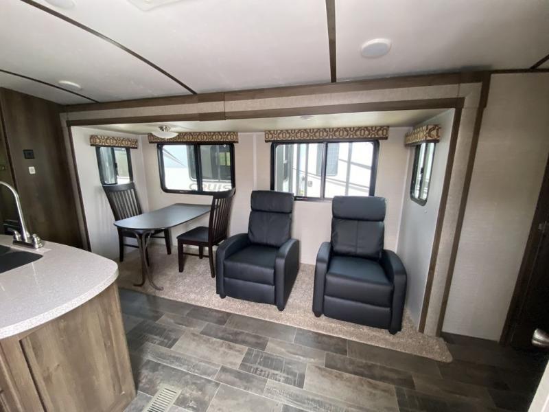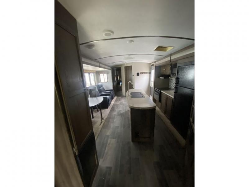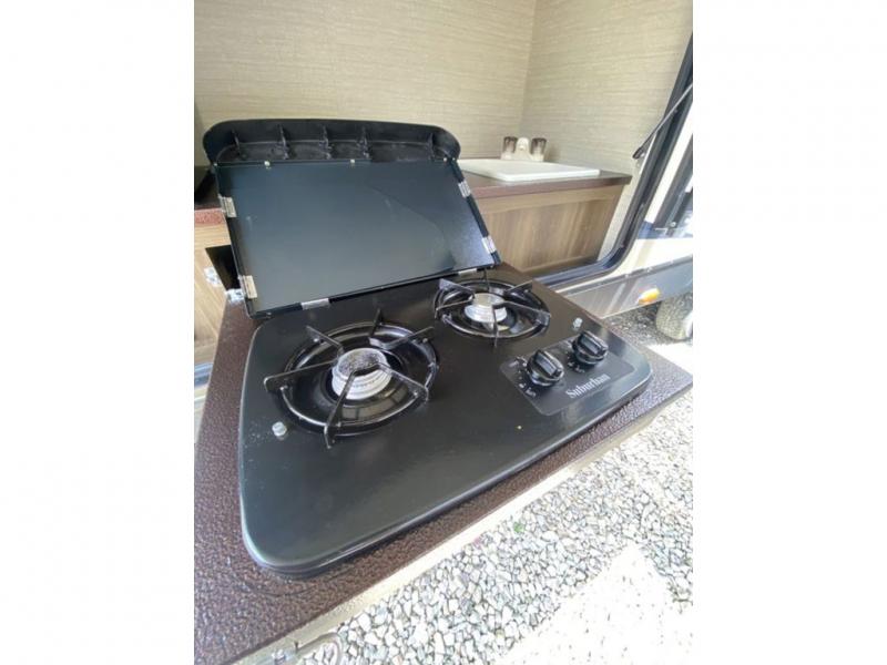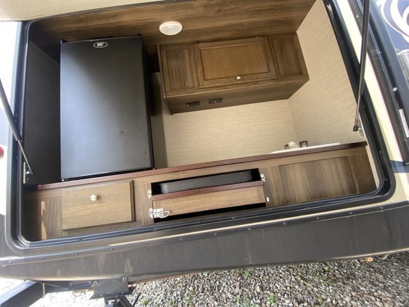 There is a pass-through storage compartment in the front for all of your exterior camping gear. There is also an outdoor kitchen that includes a two burner cooktop, a refrigerator, sink, and storage space, plus so much more!
