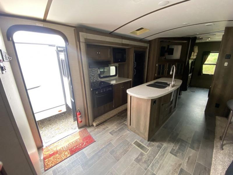Step inside to see a spacious home like atmosphere including triple slide outs that really open up the space. The kitchen and living area are combined and feature slides opposite one another. There is a center island with dual kitchen sinks for your convenience.