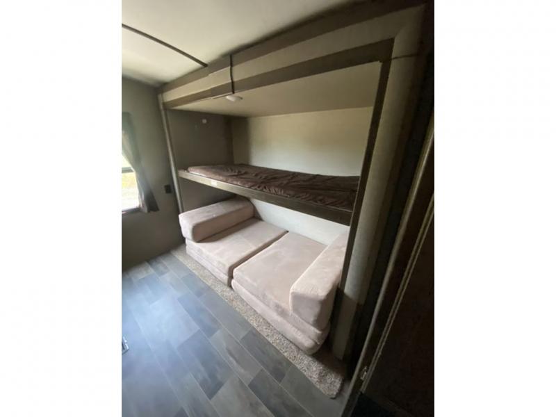 The rear bunkhouse will be a favorite room for the kids, or the perfect space for extra guests to have a private retreat of their own. There is a futon slide with 32" x 74" flip bunk above on one side, and a 32" x 74" bunk above a wardrobe opposite with a ladder to the top bunk.
