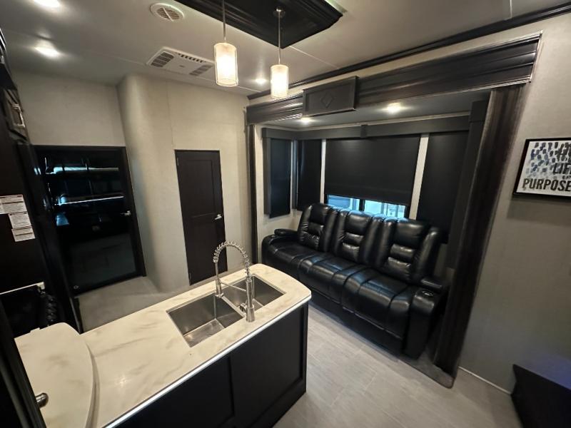Back down in the main living area you will find a slide out 97" sofa with recliners plus a dinette along the road side. On the opposite side the kitchen includes a l-shaped counter with double sink, three burner range, convection microwave, 12 cu. ft. refrigerator, and a pantry.