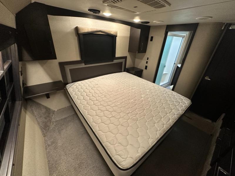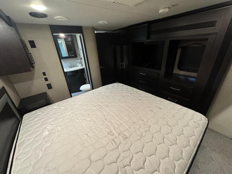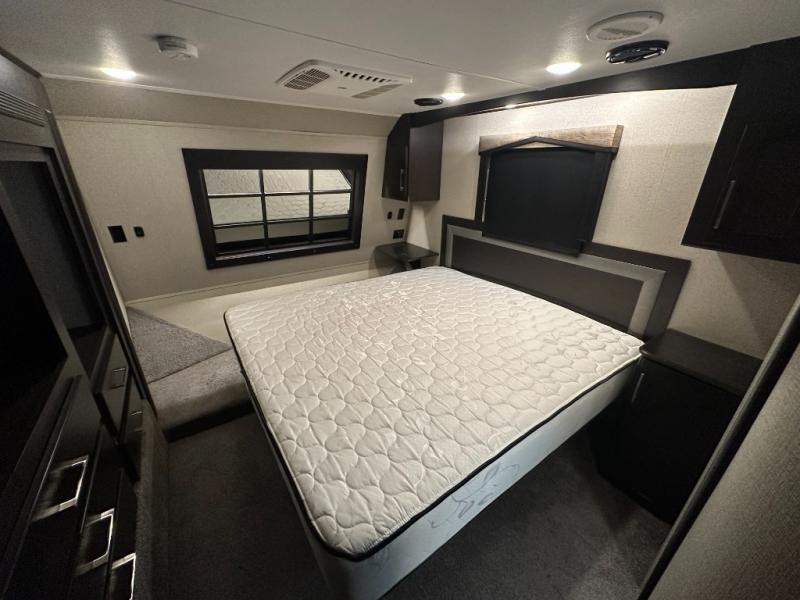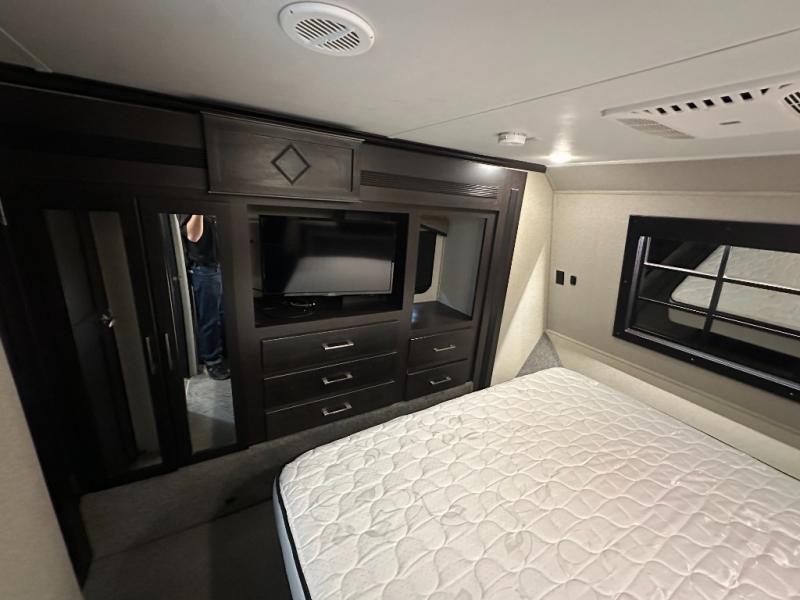 The master bedroom provides a king bed suite with storage on both sides. There is a road side slide out allowing more walking around floor space. The slide includes a wardrobe, 32" TV, and a dresser.