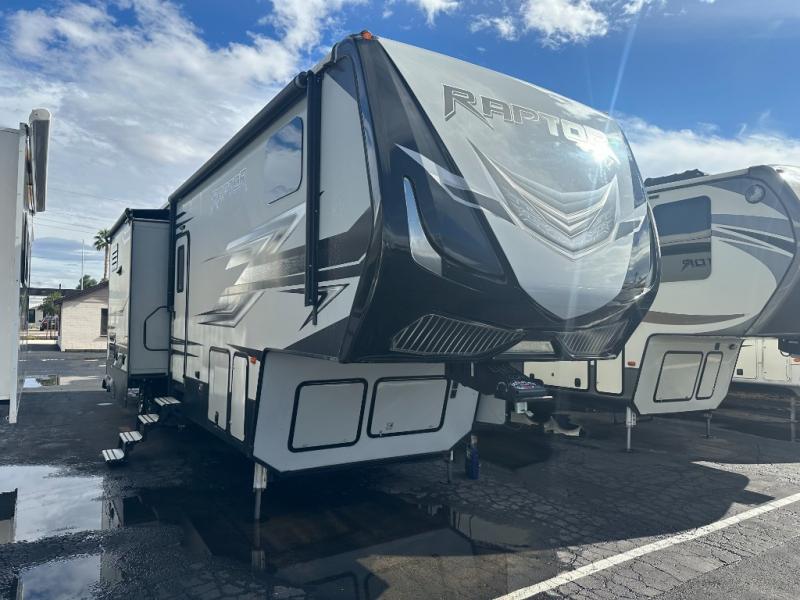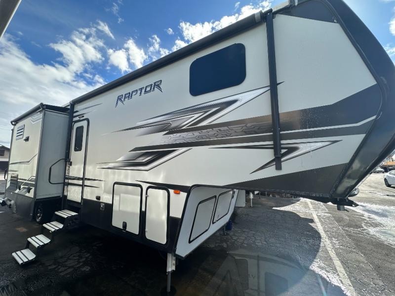 It's time to take your camping style up a notch! This triple slide Raptor 362TS toy hauler fifth wheel offers many features you don't want to leave home without.