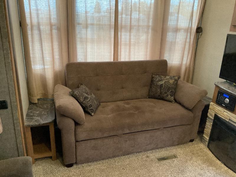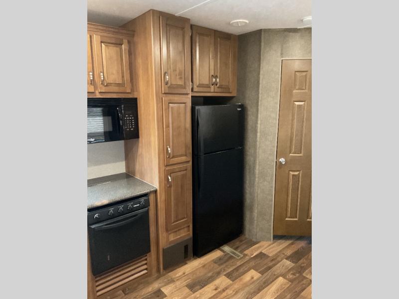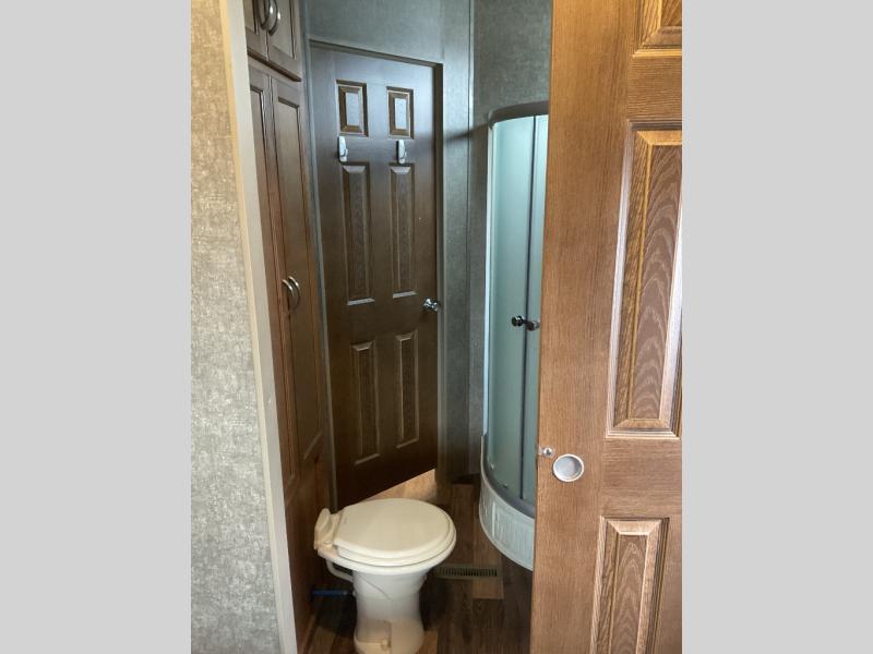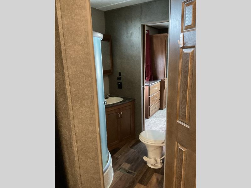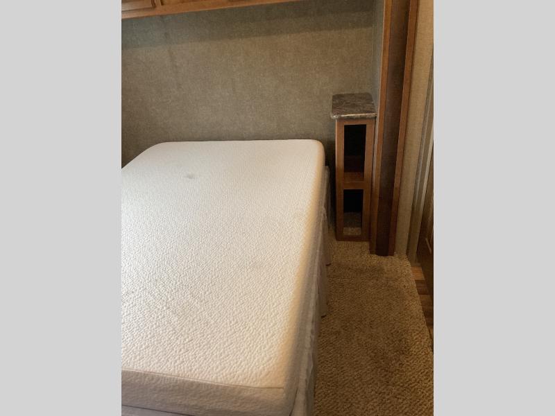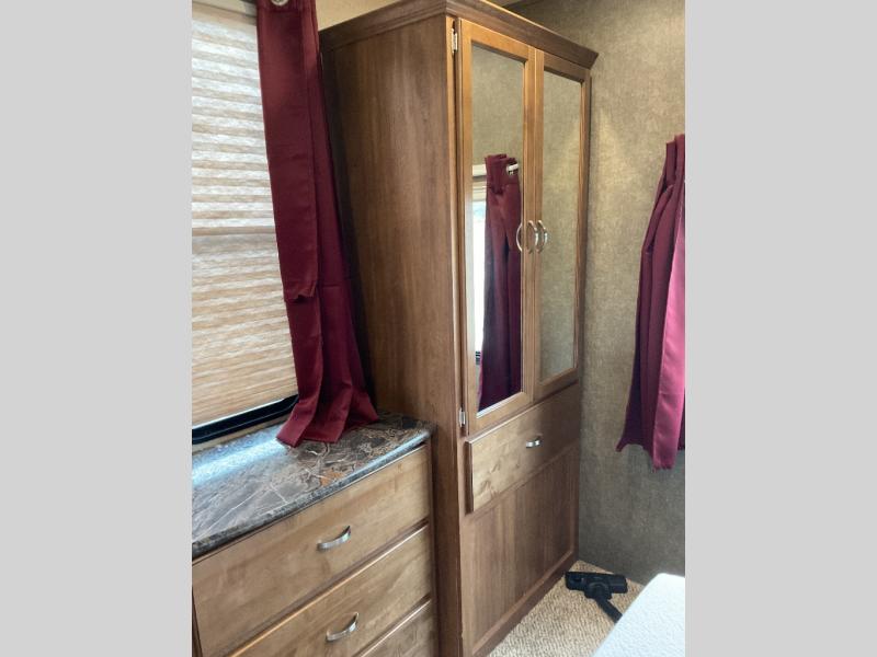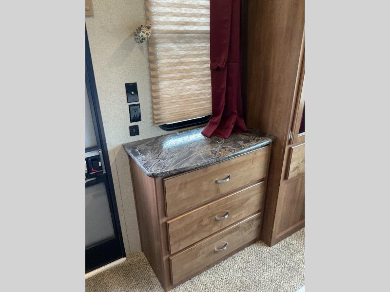 In the rear master bedroom there is a slide out with a bed and an overhead cabinet. Across from the bed there is a vanity with drawers and an armoire. A convenient entry door is also located in the bedroom, and more!
