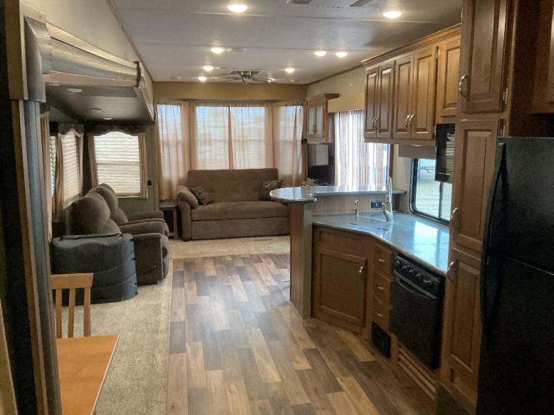 As you enter through the patio doors, you will be in the combined kitchen and living area. To the left of the door there is a raised bar top, an angled double sink, overhead cabinets, three burner range, pantry for your canned goods, and a refrigerator for your perishable food items. Along the road side of this model there is a slide out with theater seating, a table and chair, and a free-standing dinette with four chairs. A sofa can be found along the front of the living area. There are also two end tables, and to the right of the patio doors there is an entertainment center for your enjoyment.