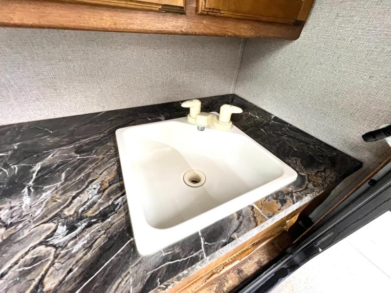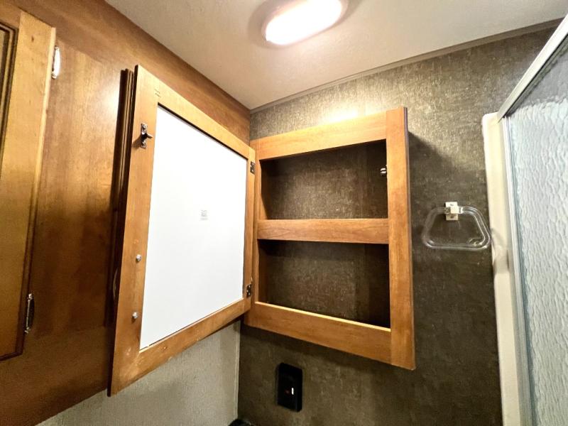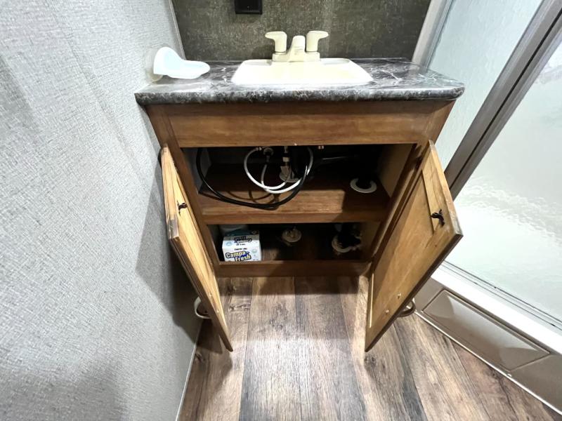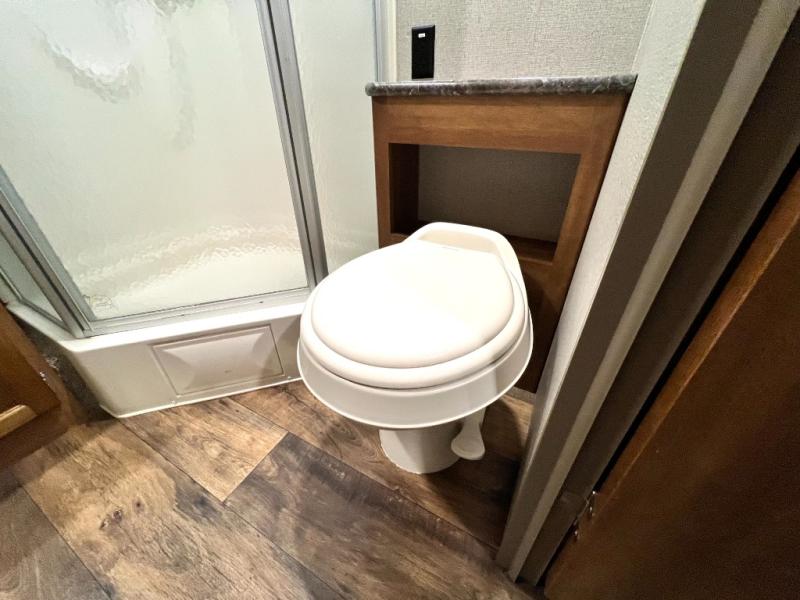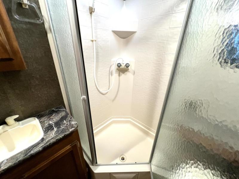 The rear bath is spacious and features an angled shower, a toilet, and a vanity with sink. You will truly love this convenience as you travel. No late night run to the campground bathroom here!