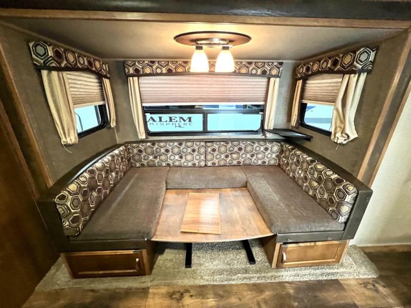 Just outside the bedroom door on your right you will find a bench seat with coat hooks above, and an entertainment center to enjoy. Adjacent a slide out u-shaped dinette provides ample seating for mealtime or just hanging out. You can also quickly transform the dinette into added sleeping space if needed at night.