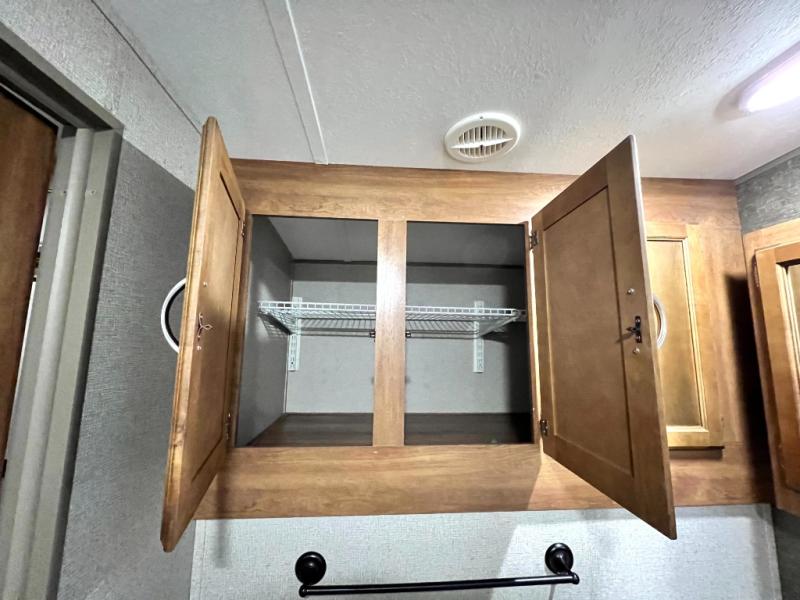 The kitchen area is to the left of the entry door and features a large sink within an angled countertop. There is also a three burner range and refrigerator for your cooking and food storage needs. Just off the dinette slide next to the bathroom door you will find a pantry for your dry and canned goods, plus more.