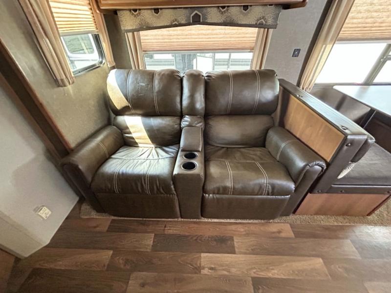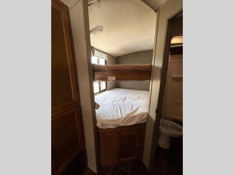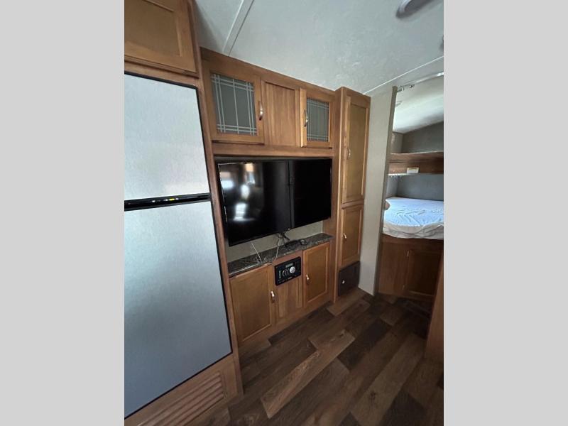 Straight ahead through the main entry you will enjoy plenty of seating within the large road side slide including a booth dinette for meals, plus theater seating for two with cup holders for conversation or movie watching. Opposite the theater seats you will find a nice entertainment center to enjoy with storage both above and below. There is also a floor to ceiling pantry cupboard between the entertainment center and rear set of double size bunk beds.