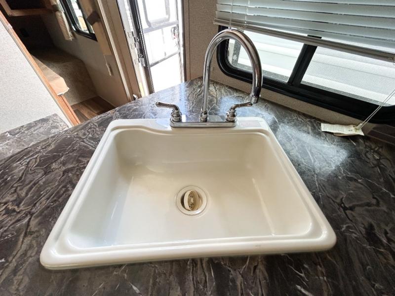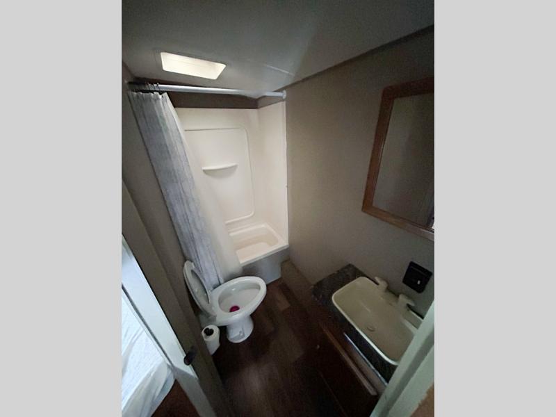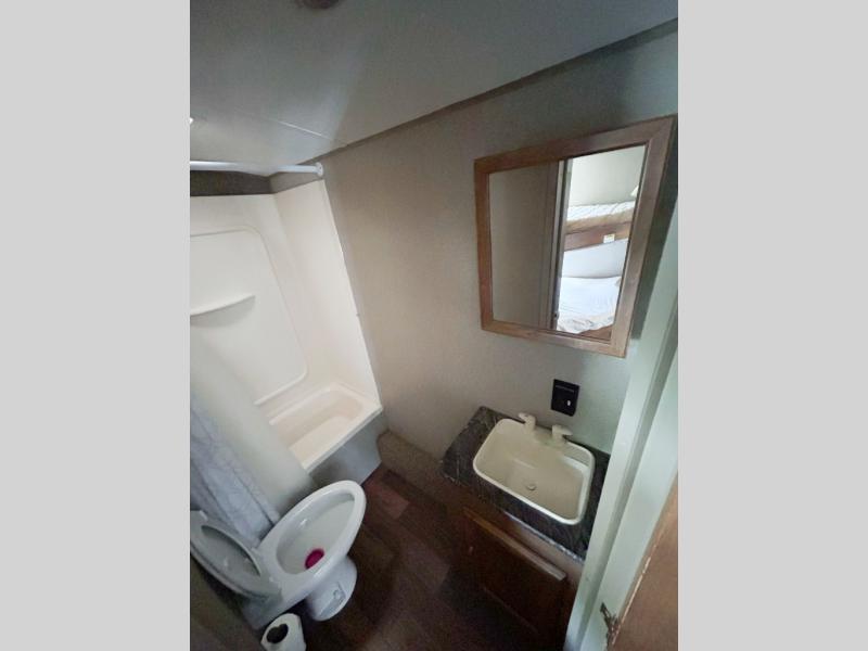In the rear left corner you will enjoy sleeping space for four adults or children with the set of double size bunk beds. The interior corner has been angled to provide more space for moving around. Right next door in the rear right corner is a full bath including a tub/shower, toilet, and vanity with sink. This is the perfect location to the bunks especially for little ones.