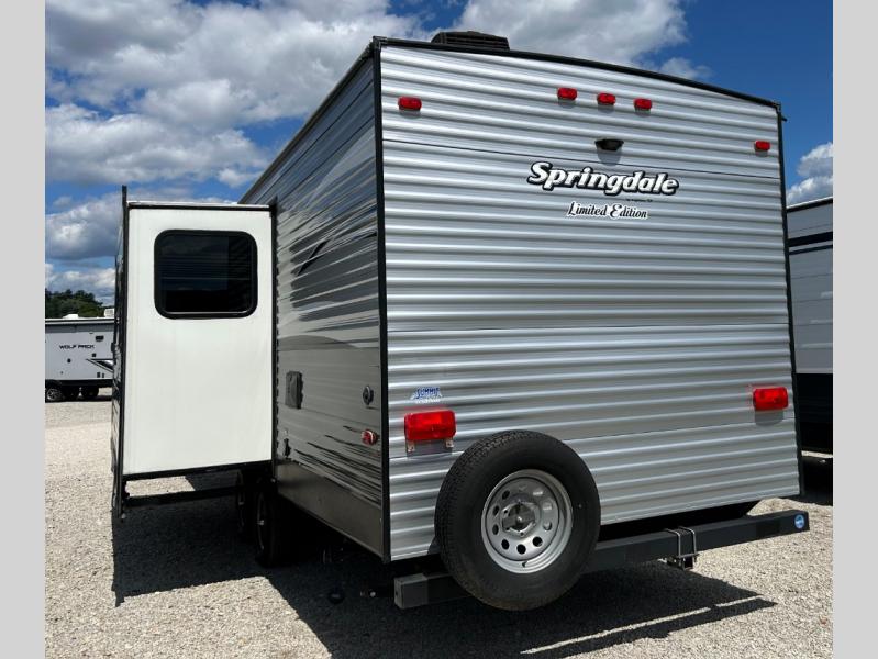 This Springdale makes camping with family and friends easy and enjoyable. Model 270LE offers a set of double size bunk beds, a large slide out for added interior space, a rear corner bath layout, an outdoor kitchen and entertainment center, plus more!
