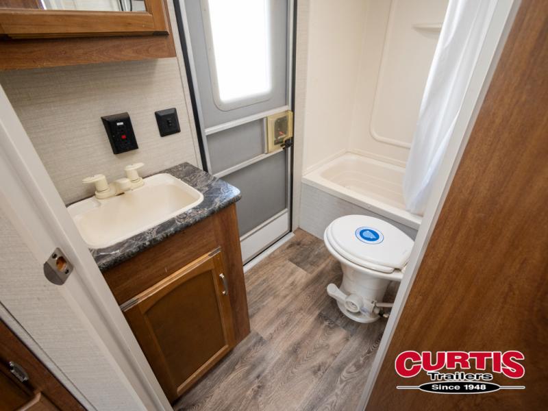 The rear right corner features double size bed bunks with a ladder making the top bed easy to reach. The left corner features a bath with private exterior entry door and includes a tub/shower, toilet and sink. The outdoor entry makes it easy to access when enjoying the outdoors. No running through the entire unit to get to the bathroom!