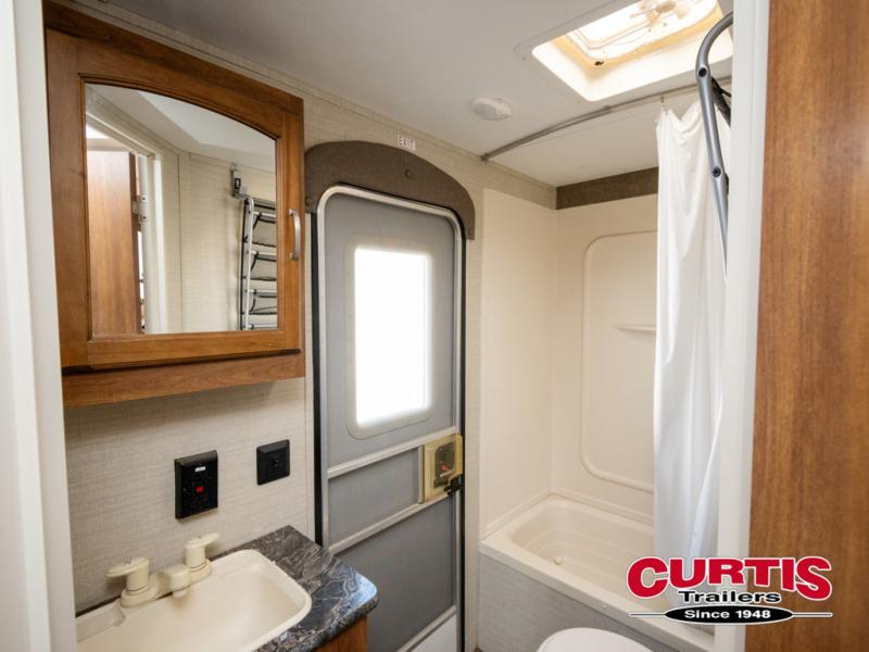 Step inside the main entrance closest to the front and find an entertainment center with LCD TV straight ahead. There are curtains on either side of the unit that can be pulled to allow a bit more privacy in the front bedroom where you will enjoy sleeping on a queen size bed. There are also nightstands and bedside closets, plus an overhead cabinet for storage.