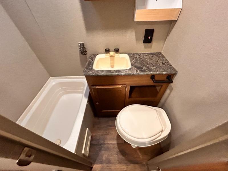 In the side aisle bathroom you will find a toilet, vanity with sink, and a tub/shower.