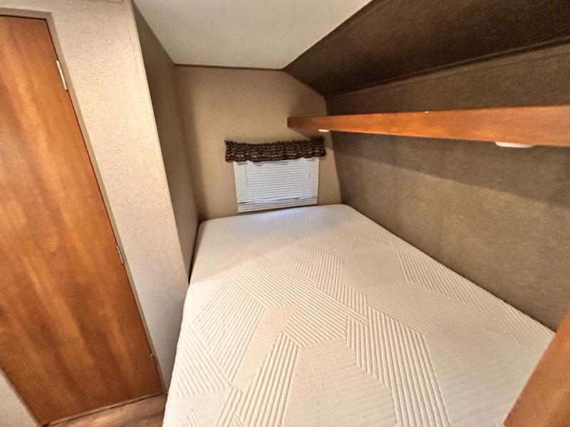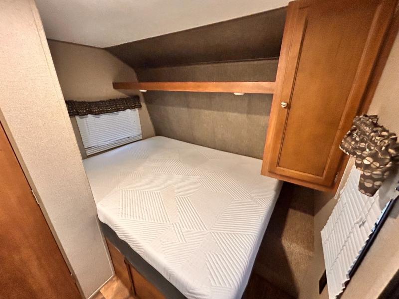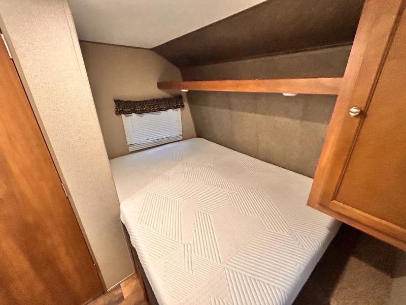 Step inside to see a front queen bed with overhead storage across the front wall, and a closet at the foot of the bed. The bed is turned width wise with the head of the bed along the road side wall.