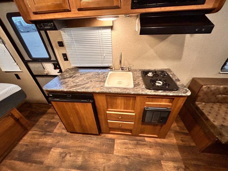 The kitchen area is beside the entry door and features counter space, overhead cabinets, a single sink, and a two burner cook-top. A food storage pantry is on the opposite side of the trailer.