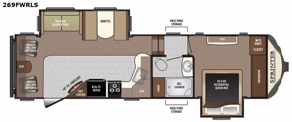 This Sprinter fifth wheel model 269FWRLS features a wide body design for added interior space. You will enjoy a rear living layout, double slides, and a fireplace also!