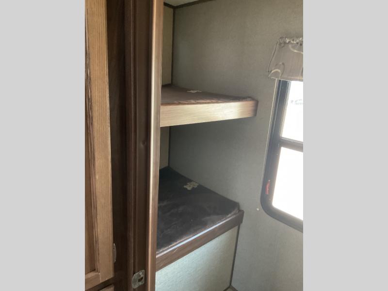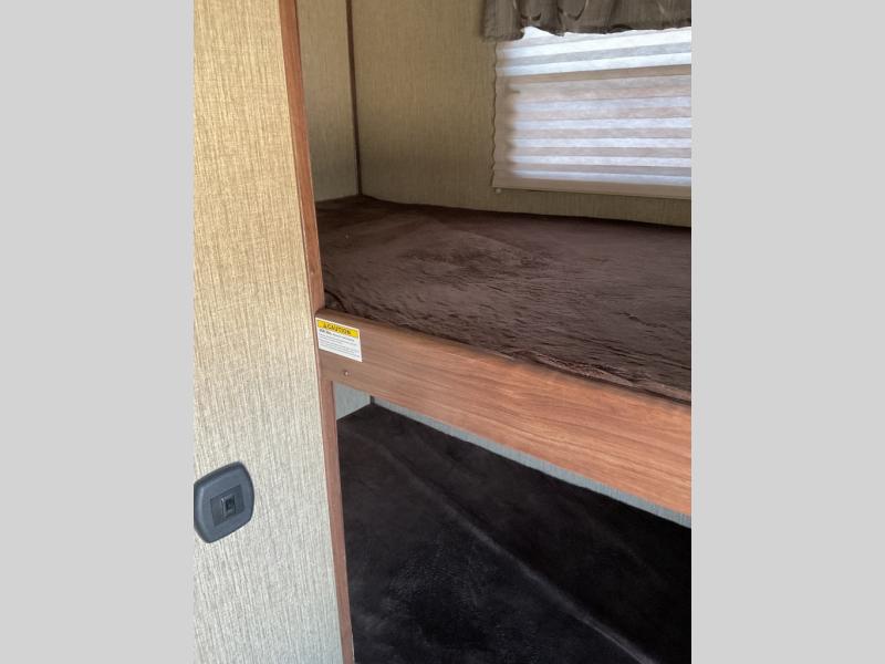 The rear bunkhouse features a wardrobe along the road side wall, and a 36" x 74" lower bunk with overhead bunk above on the opposite side making this private space a fun retreat for entertainment or sleeping.