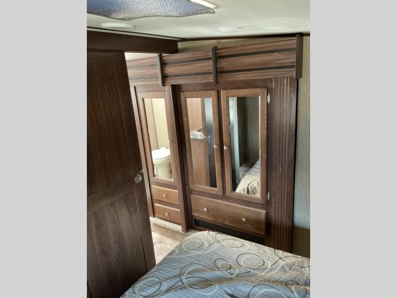 The front bedroom features a residential queen bed slide with closets on each side, and a wardrobe slide along the road side wall that is part of the bedroom and the bath.