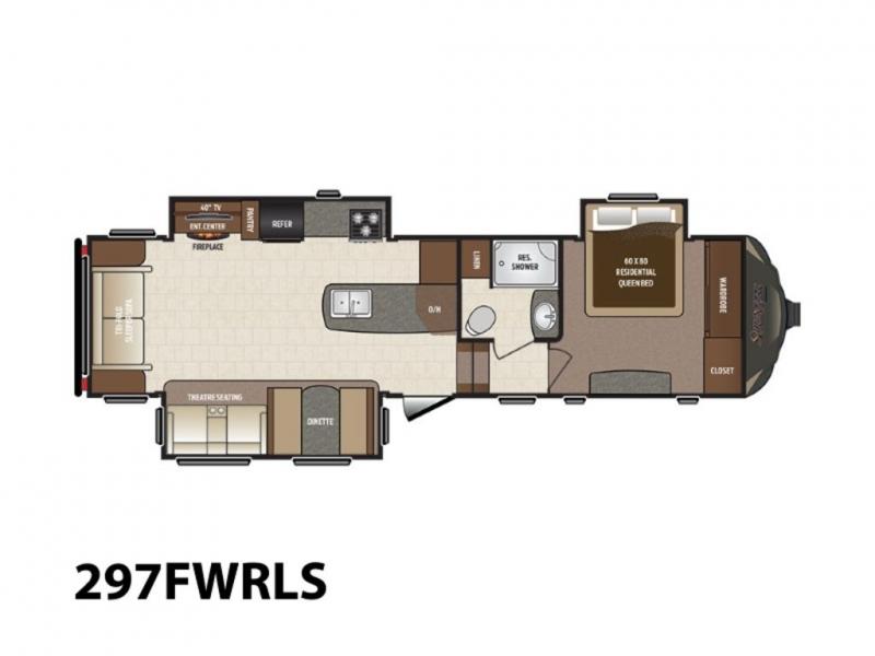 Enter model 297FWRLS and head up the steps on your right to the front master bedroom and side aisle bath. The bathroom offers a residential shower, toilet, sink, and linen cabinet. The private master bedroom at the end of the hall features a slide out residential queen size bed. There is also a dresser opposite, plus a front wall wardrobe and closet prepped for a washer/dryer for all of your clothing and storage needs.