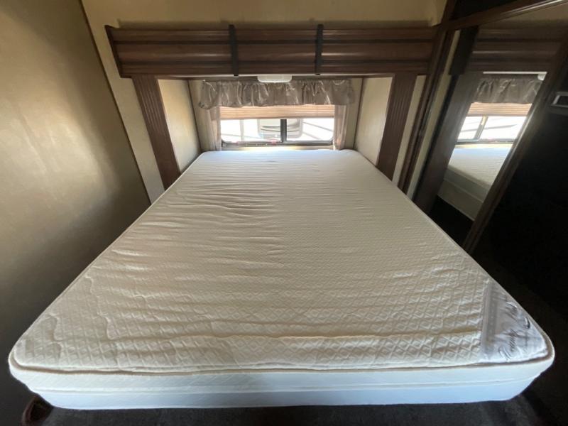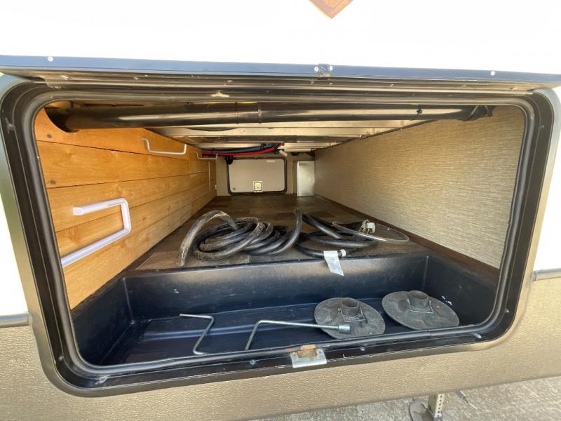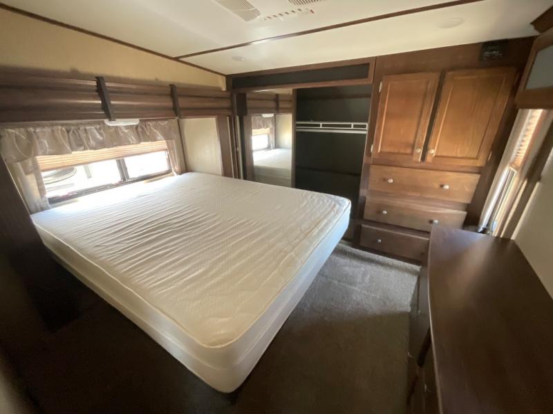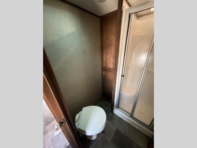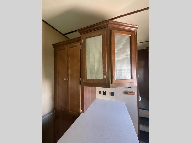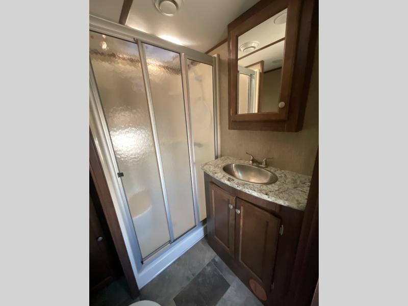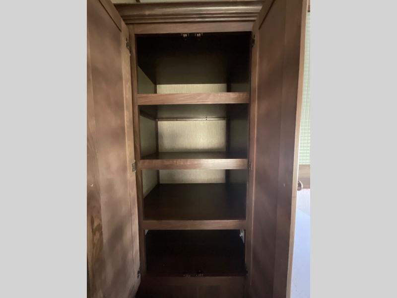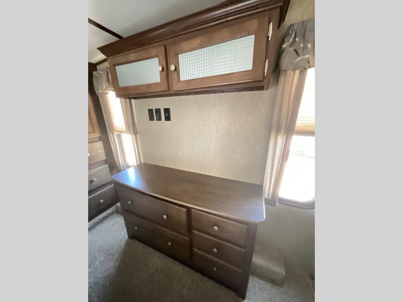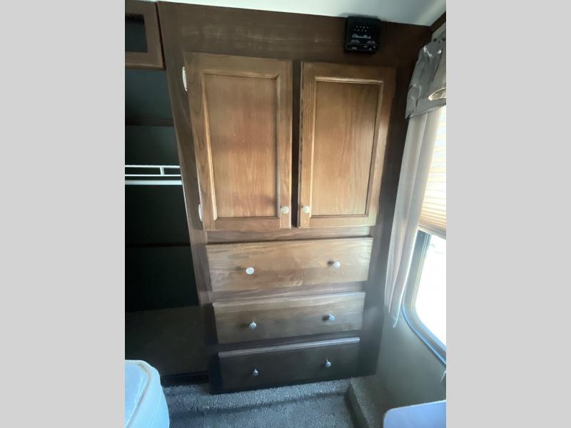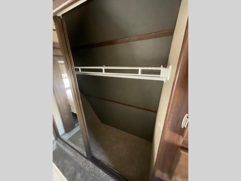 Enter model 298FWRLS and head up the steps on your right to the front master bedroom and side aisle bath. The bathroom offers a residential shower, toilet, sink, and linen cabinet. The private master bedroom at the end of the hall features a slide out residential queen size bed. There is also a dresser opposite, plus a front wall wardrobe and closet prepped for a washer/dryer for all of your clothing and storage needs.