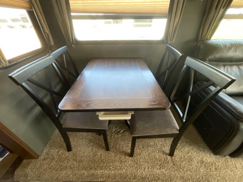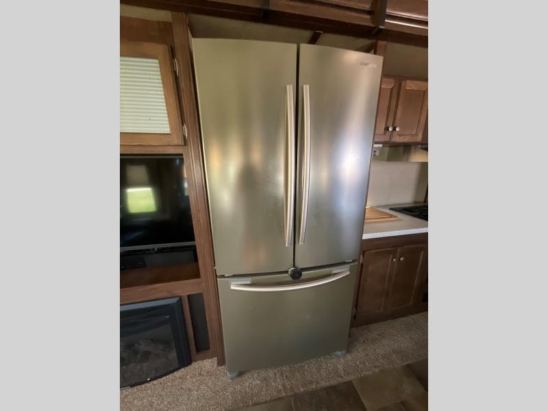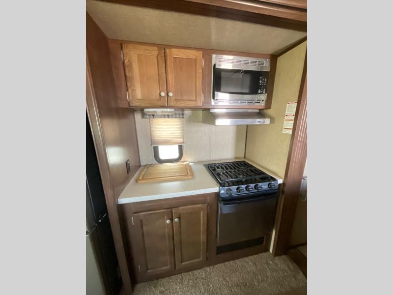 The kitchen provides everything you need to prepare and cook food for your family. There is a large L-shaped counter area with a sink on the end and overhead cabinets for all of your dishes and things, plus a slide out along the road side that includes a three burner range and 18 cu. ft. residential refrigerator. You will also find more storage space near the entertainment center that is mentioned above, plus so much more!