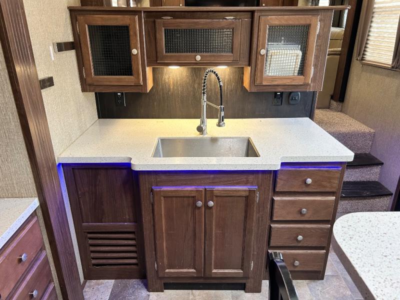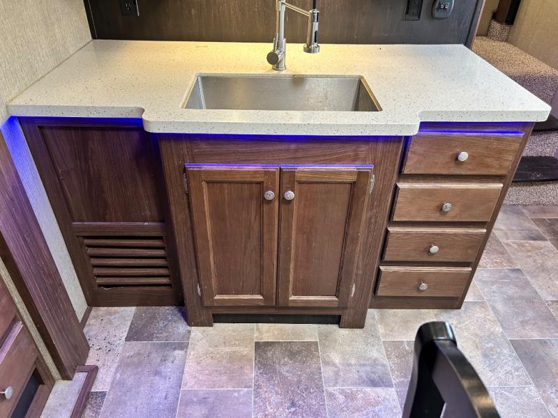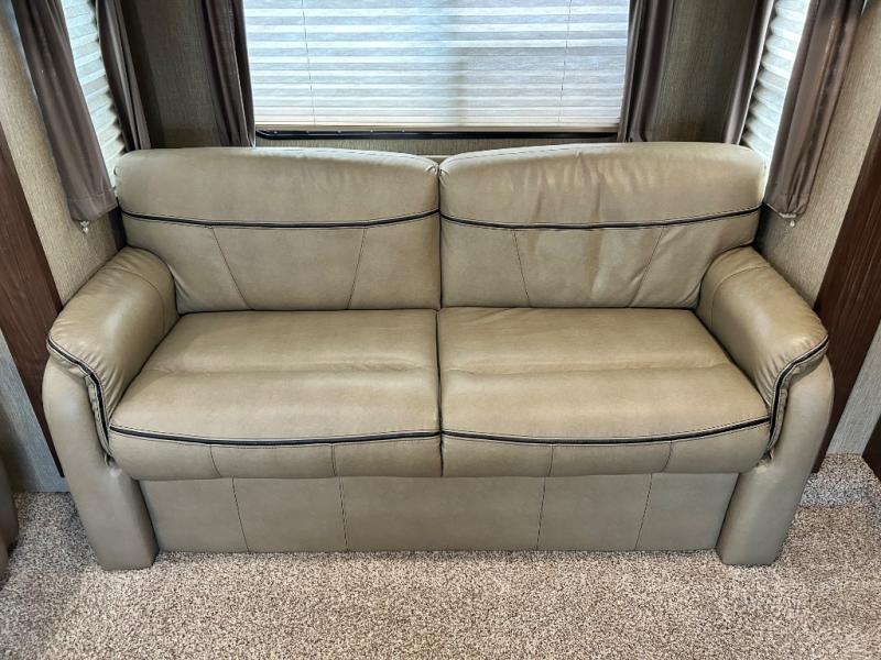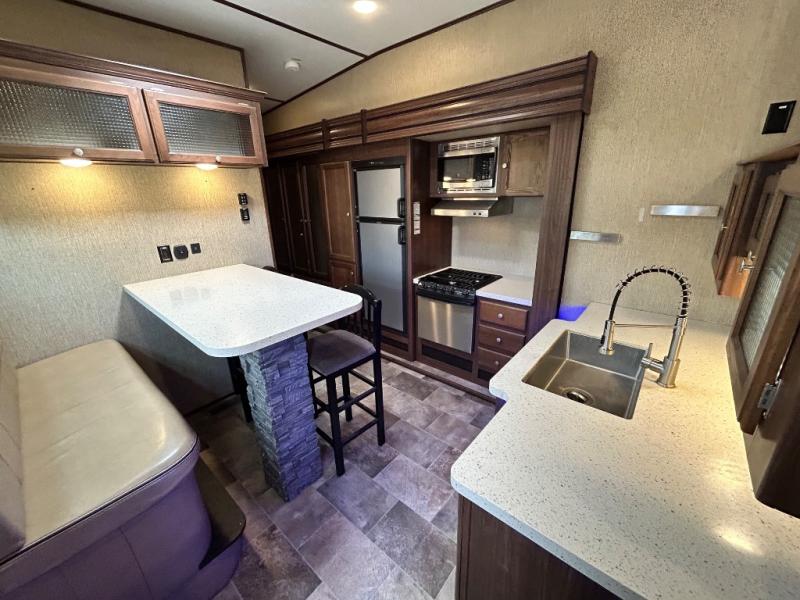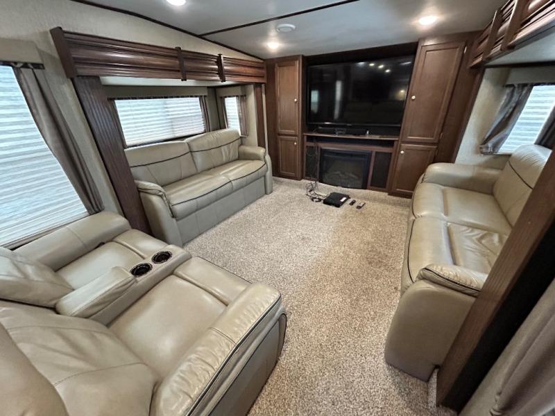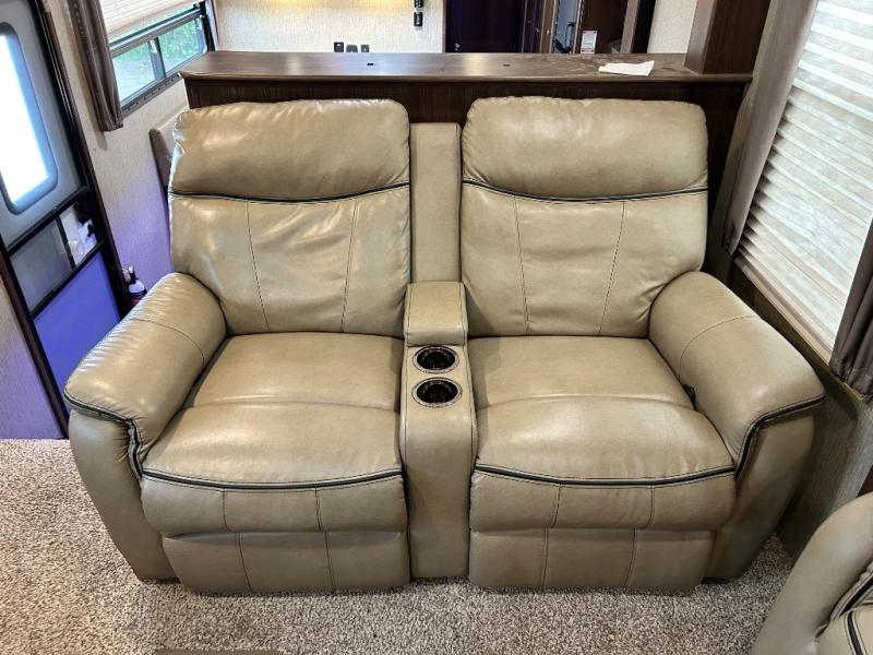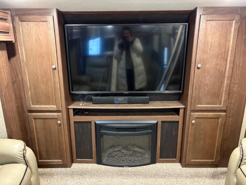 Head up the steps towards the front of the fifth wheel to a raised living area which is perfect for entertaining guests. There is theater seating, dual slide out tri-fold sleeper sofas, and a front wall entertainment center with 40" TV including a fireplace below. You will also find plenty of floor space for the kids to sprawl out and enjoy a family movie, plus so much more!