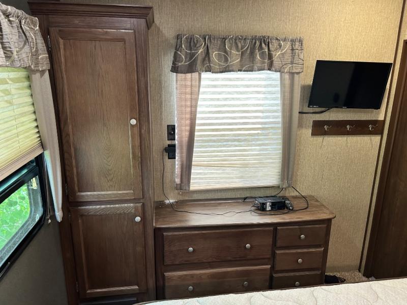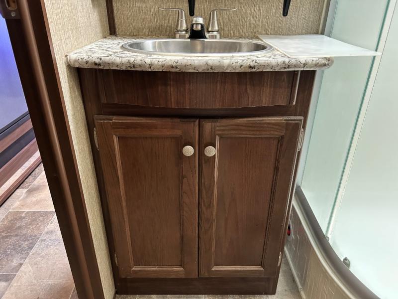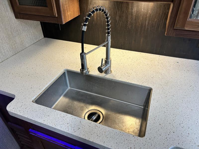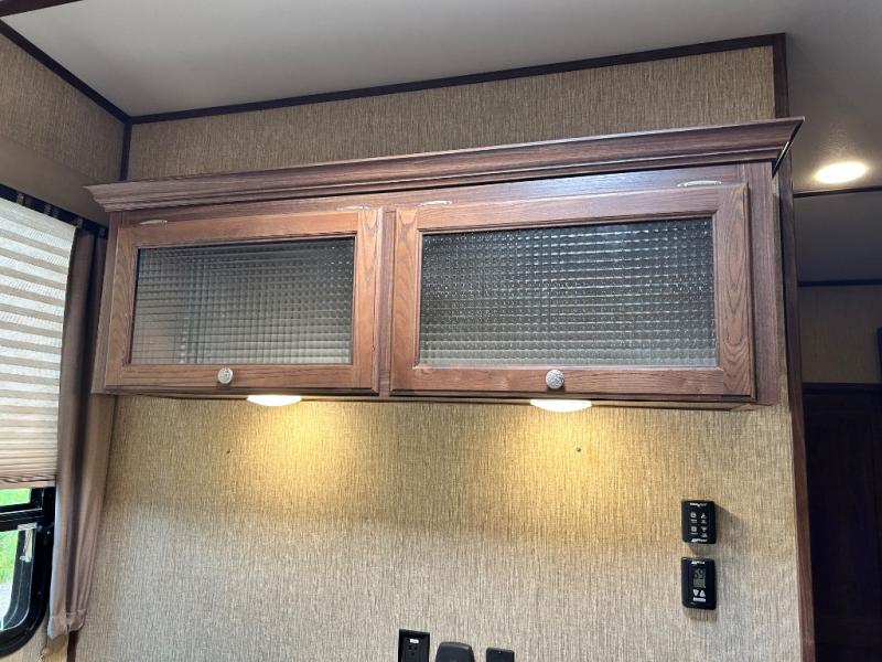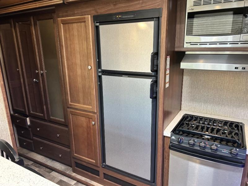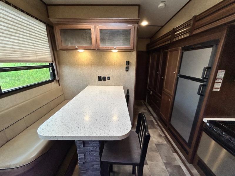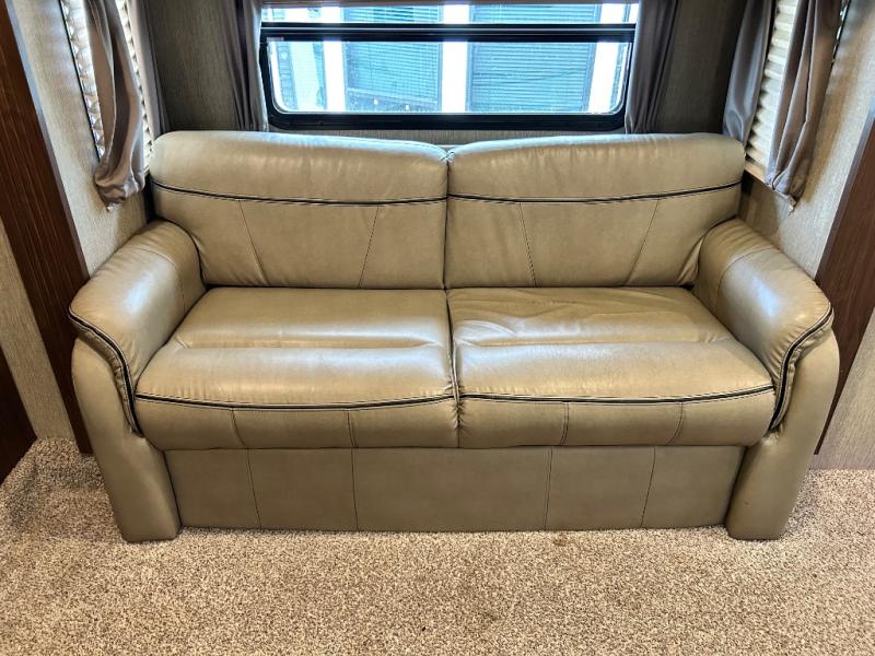 Head up the steps towards the front of the fifth wheel to a raised living area which is perfect for entertaining guests. There is theater seating, dual slide out tri-fold sleeper sofas, and a front wall entertainment center with 40" TV including a fireplace below. You will also find plenty of floor space for the kids to sprawl out and enjoy a family movie, plus so much more!