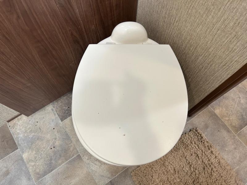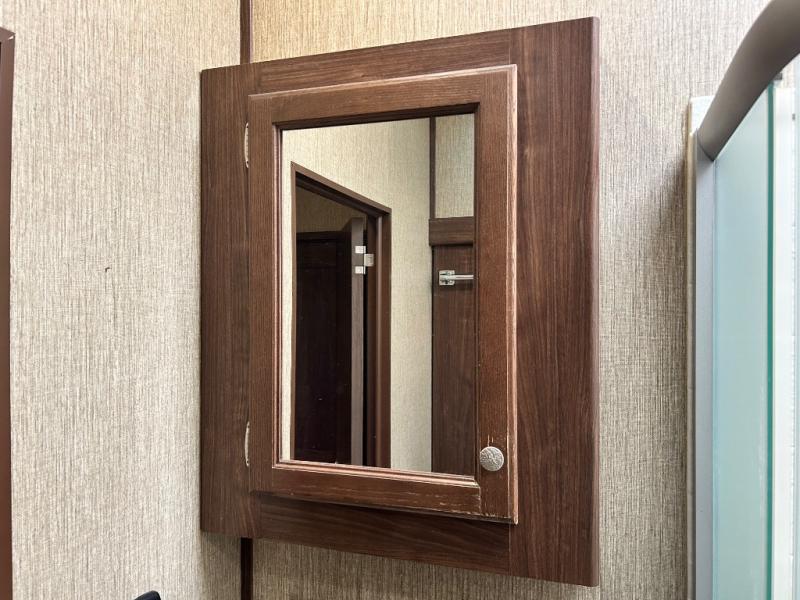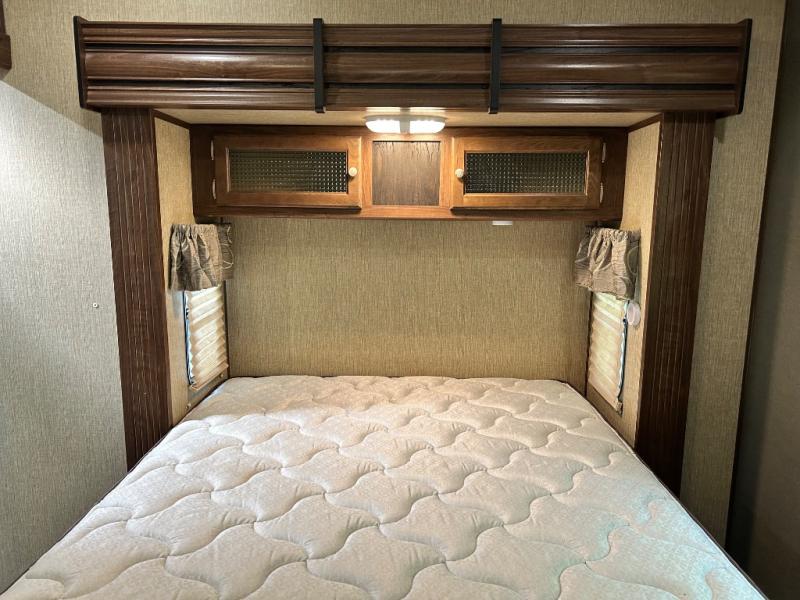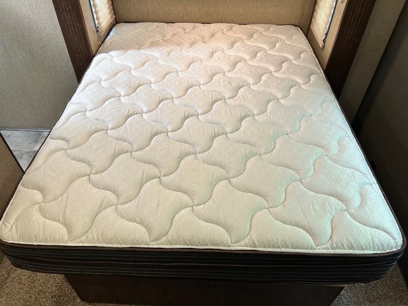 The master bedroom features a quiet retreat away from it all where you can enjoy a slide out residential queen size bed, dresser, cabinet, and overhead storage. Remember there is more wardrobe storage directly across from the bathroom.