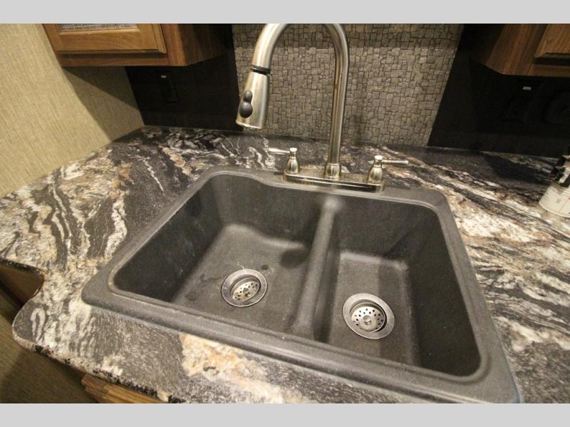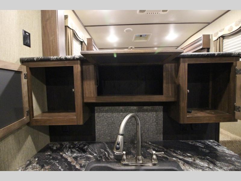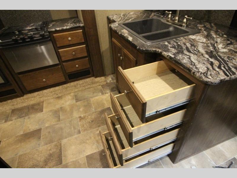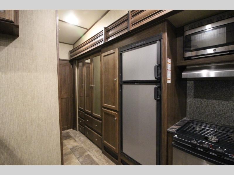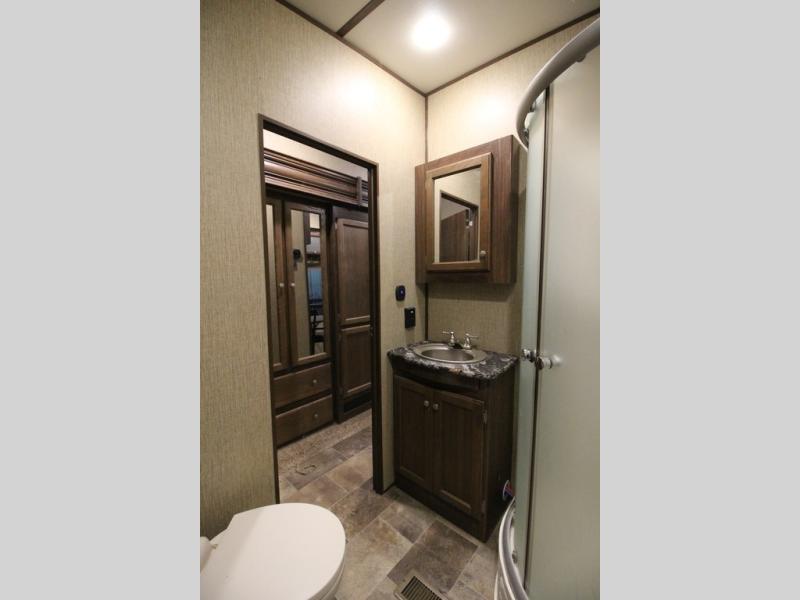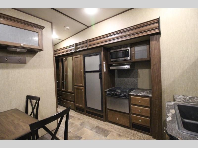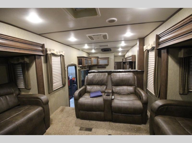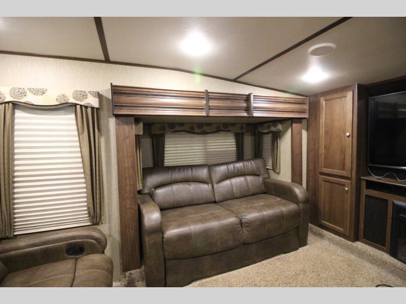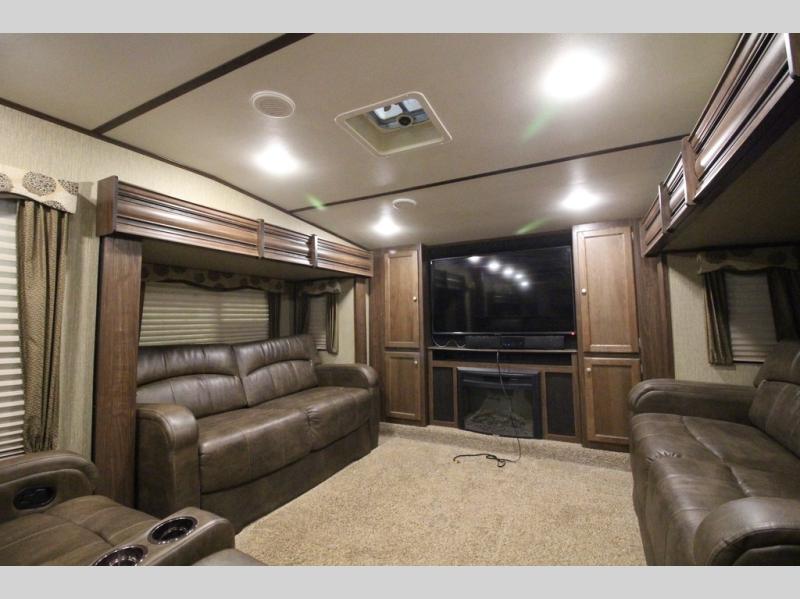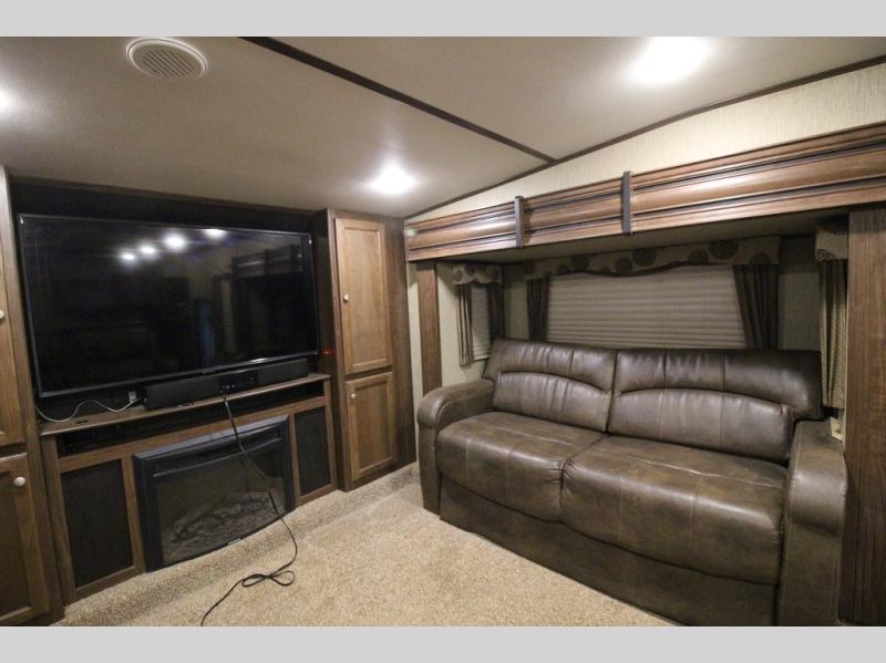 Head up the steps towards the front of the fifth wheel to a raised living area which is perfect for entertaining guests. There is theater seating, dual slide out tri-fold sleeper sofas, and a front wall entertainment center with 40" TV including a fireplace below. You will also find plenty of floor space for the kids to sprawl out and enjoy a family movie, plus so much more!