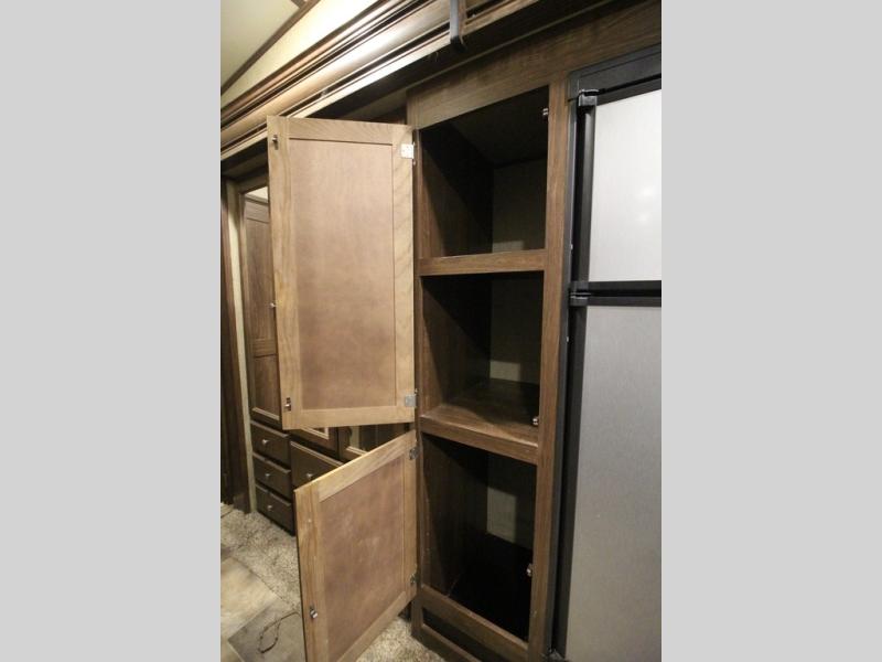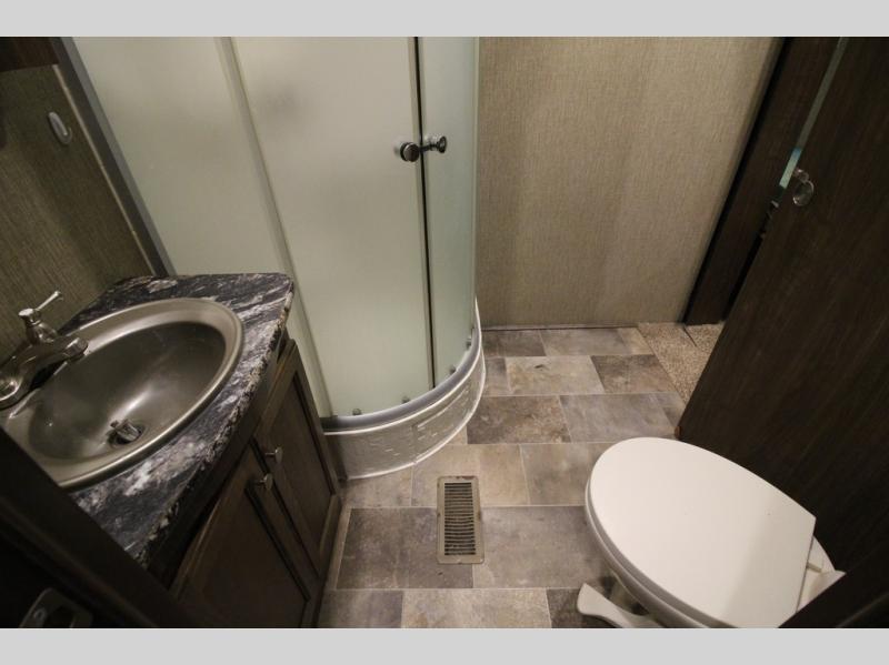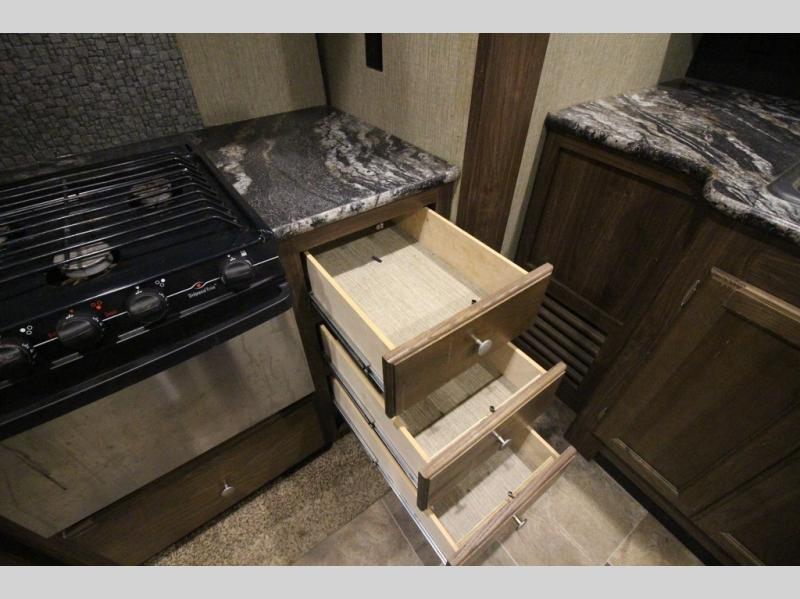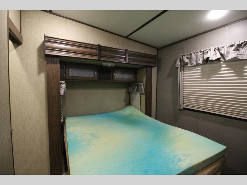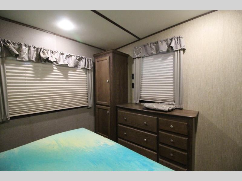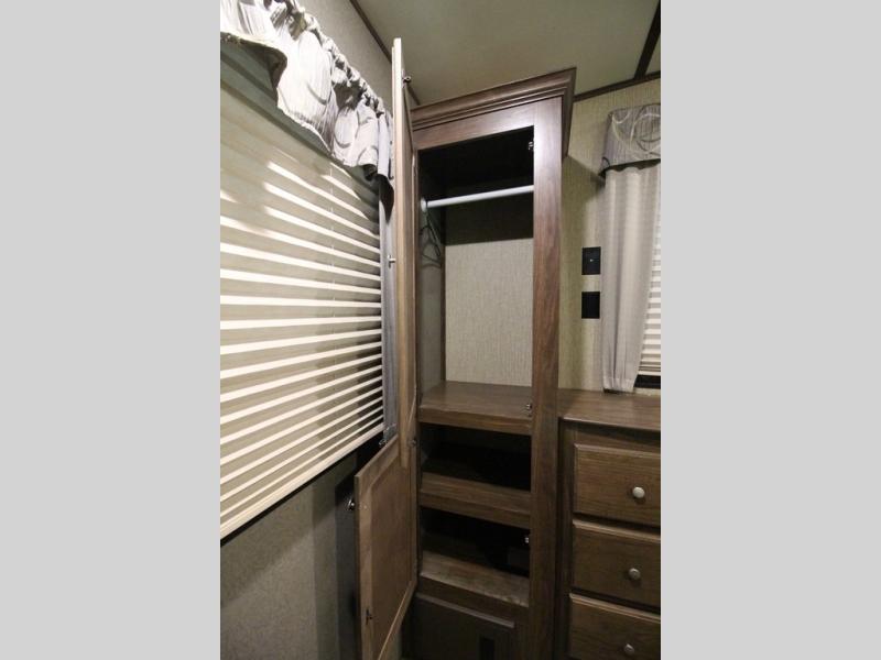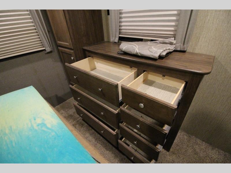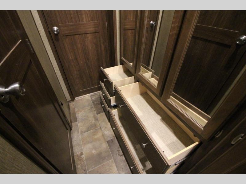 The master bedroom features a quiet retreat away from it all where you can enjoy a slide out residential queen size bed, dresser, cabinet, and overhead storage. Remember there is more wardrobe storage directly across from the bathroom.