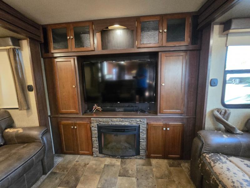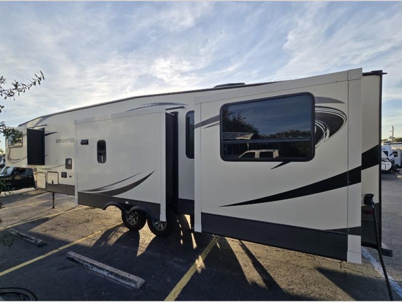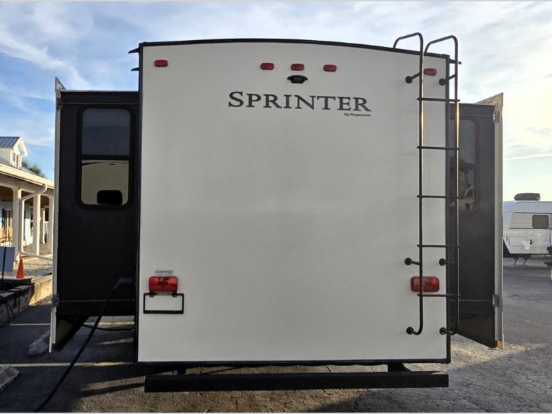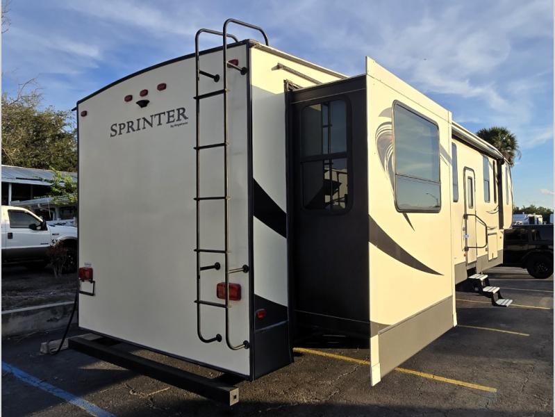 This Keystone Sprinter fifth wheel features a wide body design with quadruple slides which increases the size even more when all slides are fully extended. You are sure to love the den area with the rear entertainment center and fireplace.