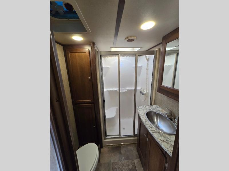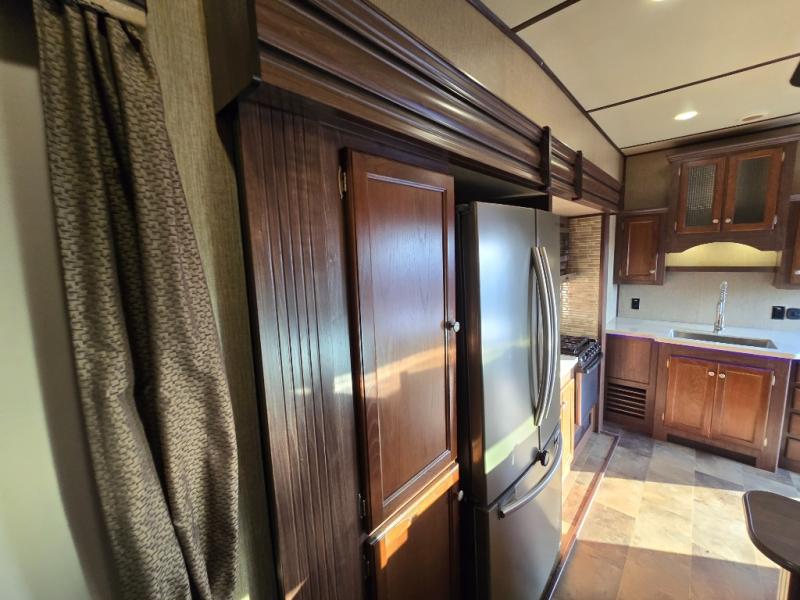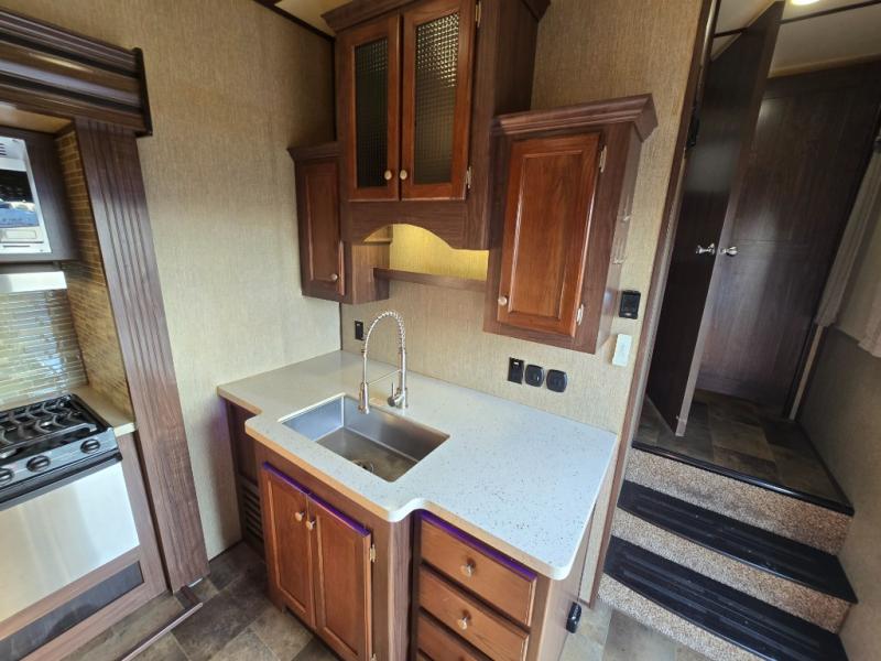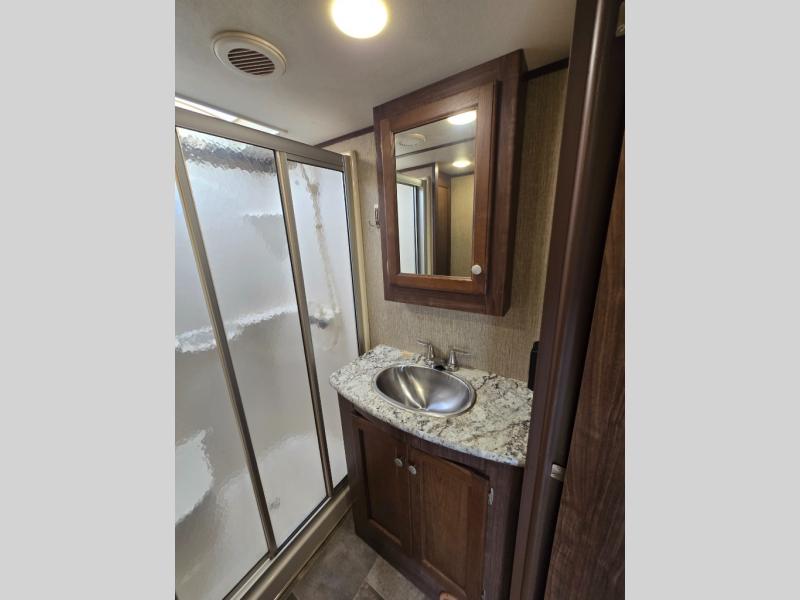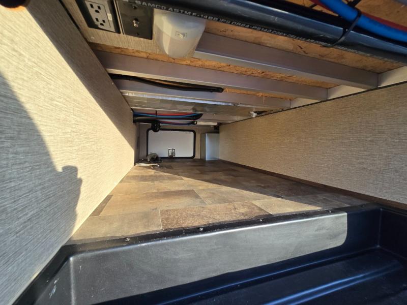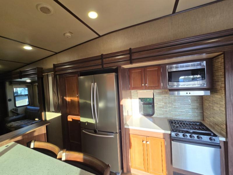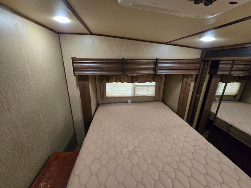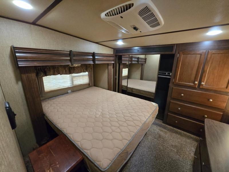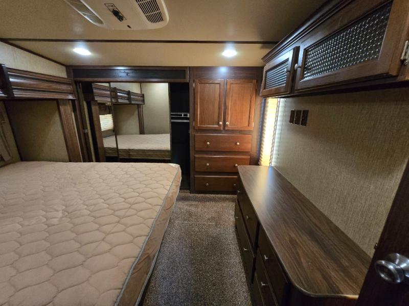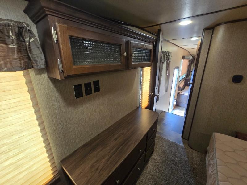 Enter model 353FWDEN and head up the steps on your right to the front master bedroom and side aisle bath. The bathroom offers a residential shower, toilet, sink, and linen cabinet. The private master bedroom at the end of the hall features a slide out residential queen size bed. There is also a dresser opposite, and full front wall wardrobe and closet prepped for a washer/dryer for all of your clothing storage needs.
