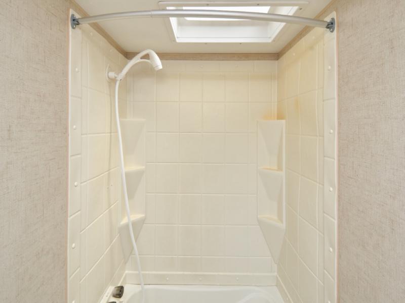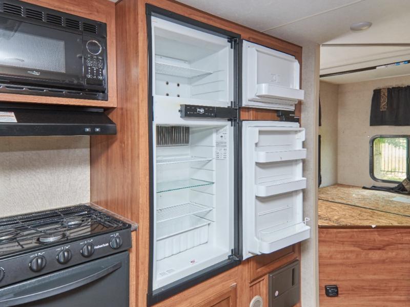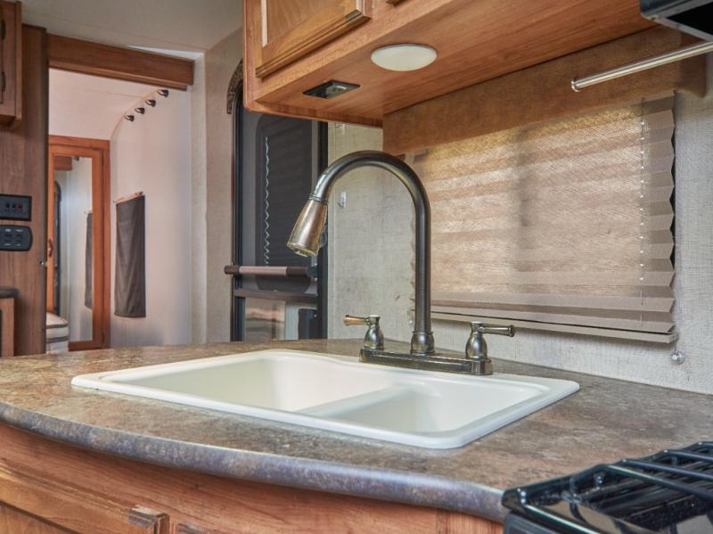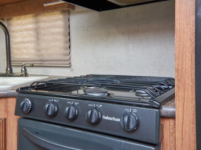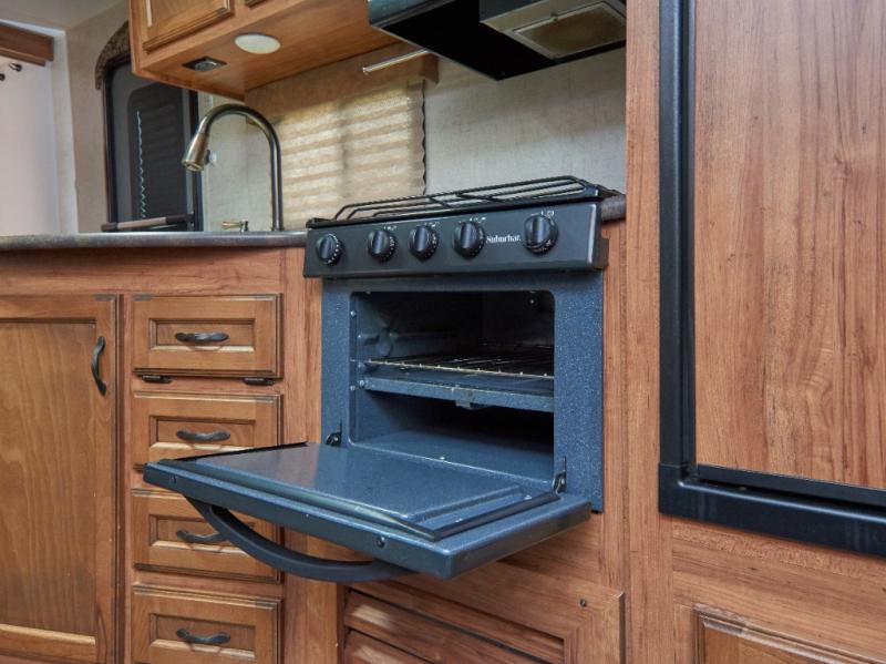 Kitchen Features: The well-equipped kitchen includes an angled double sink, three-burner range, refrigerator, and pantry, giving you everything you need to prepare meals on the road.