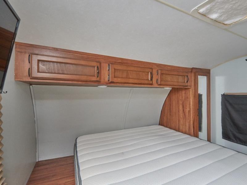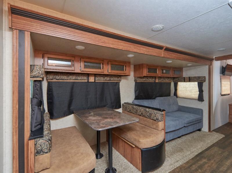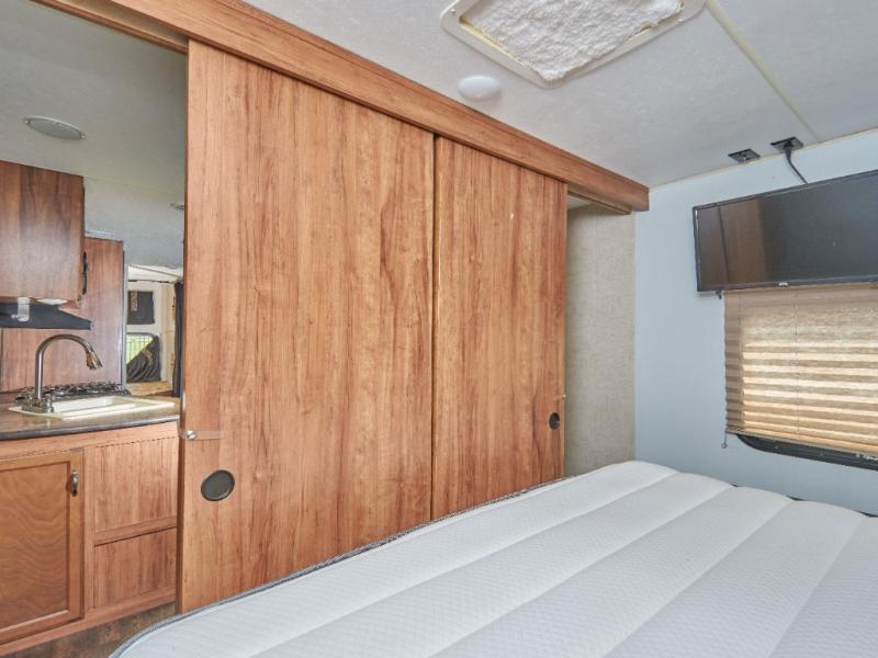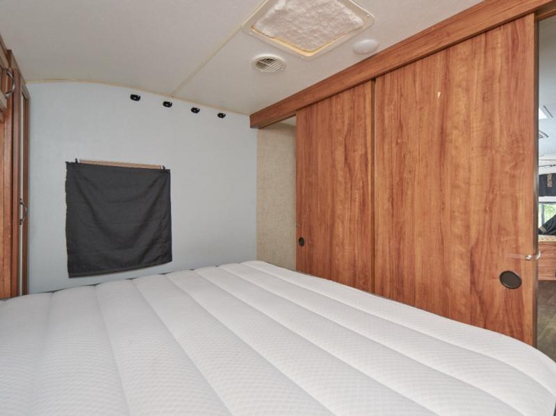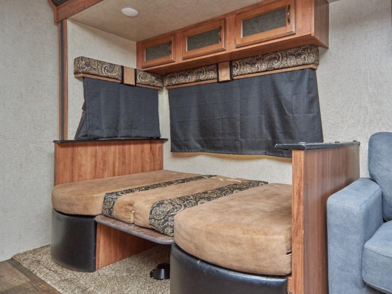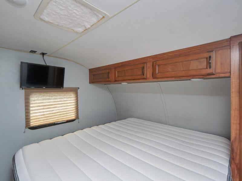 Interior Highlights: Step inside to find a cozy front bedroom featuring a queen bed and dual wardrobes, plus a convenient TV mount for evening entertainment. The central living area includes a slide-out with a sofa and booth dinette—perfect for relaxing or gathering around the entertainment center.