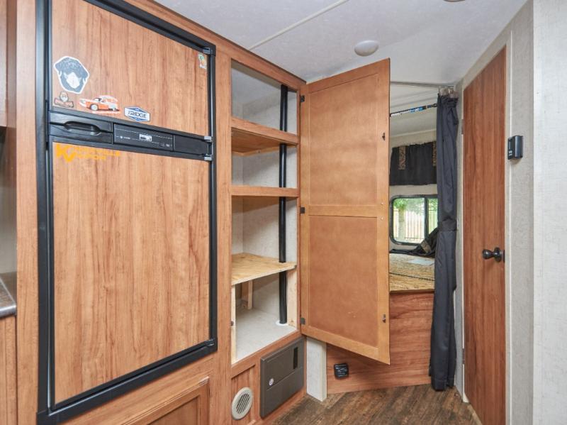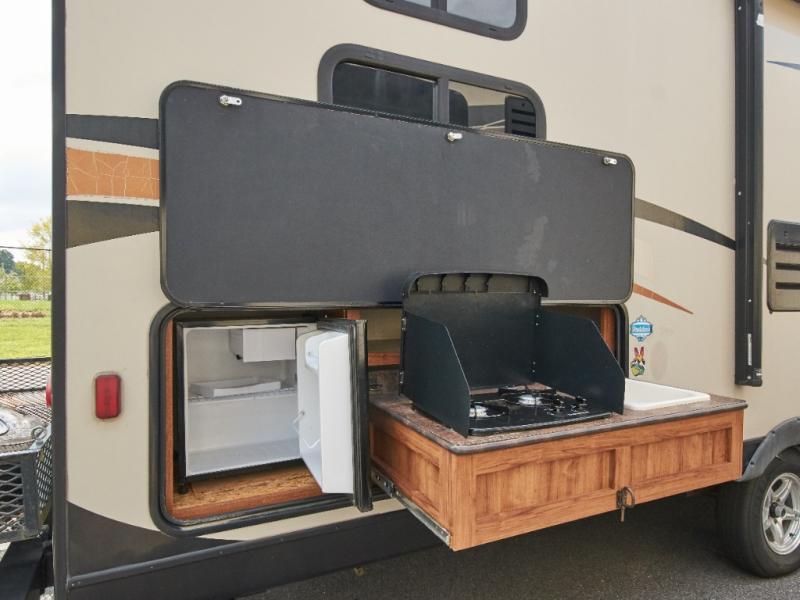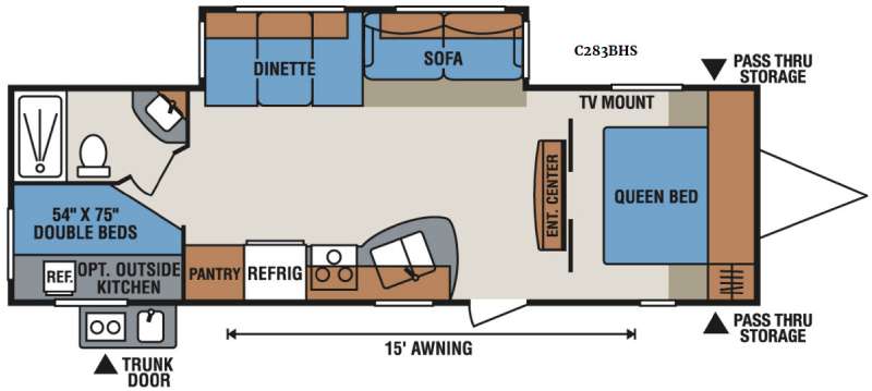 Smart Storage & Outdoor Options: Enjoy ample overhead cabinetry throughout, plus a front exterior pass-through storage compartment and a curbside trunk door for added convenience. You can also opt for the available outdoor kitchen, complete with a refrigerator, two-burner cooktop, and sink.