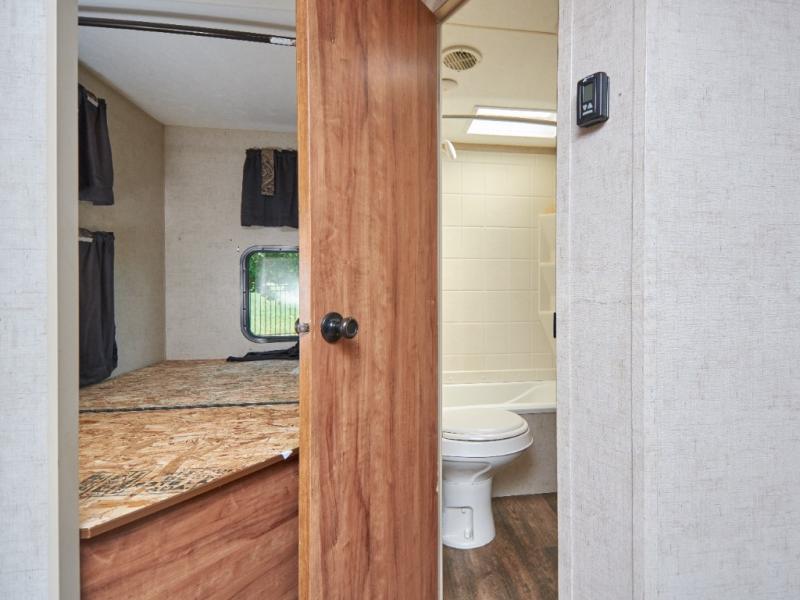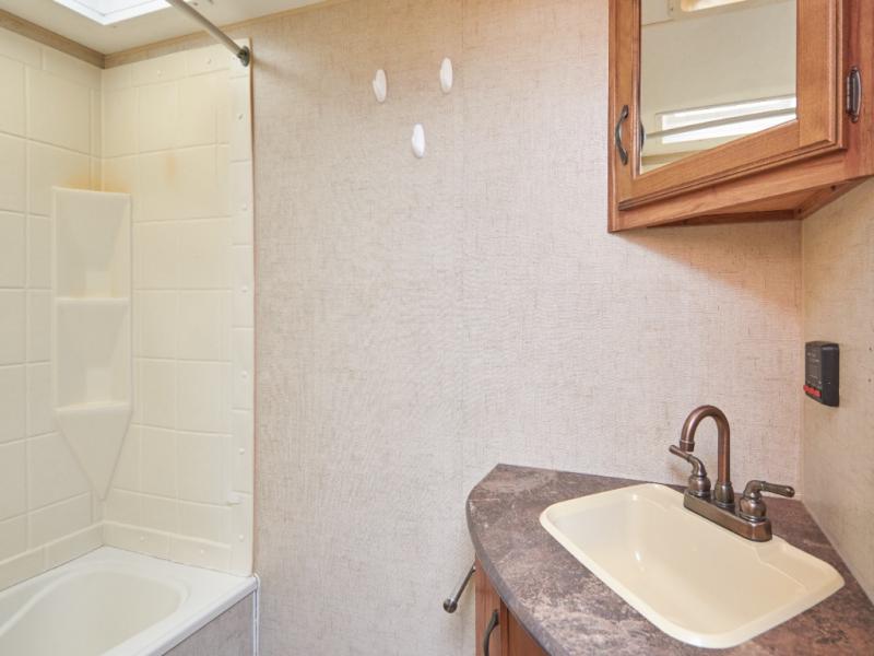 Bathroom & Bunks: At the rear, you'll find a full bathroom with a tub, toilet, and sink. Adjacent to the bath is a set of double-size bunk beds—ideal for kids or guests.