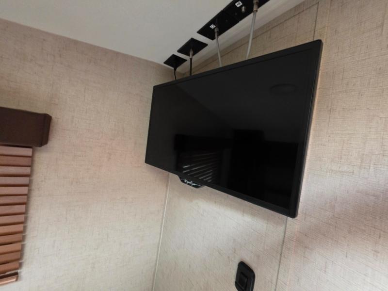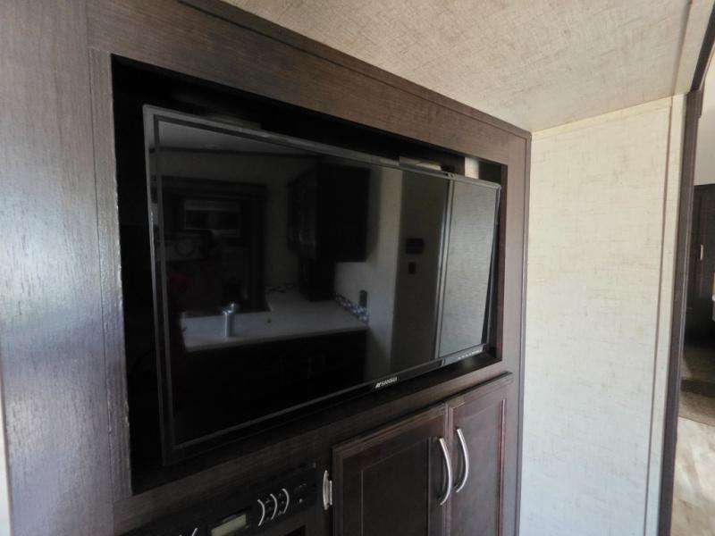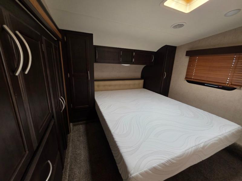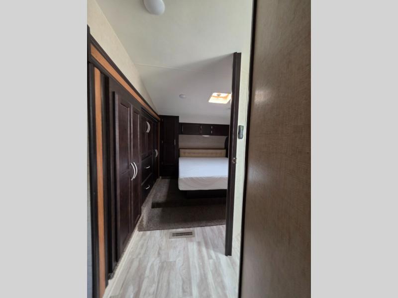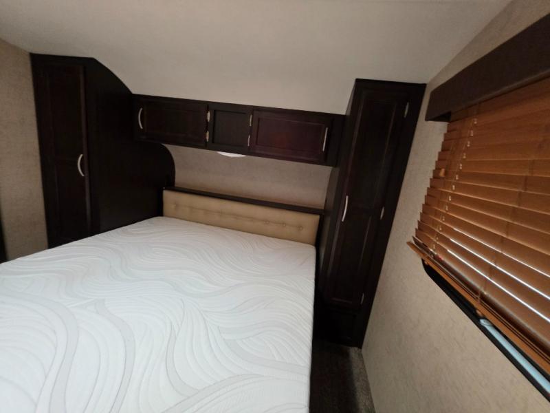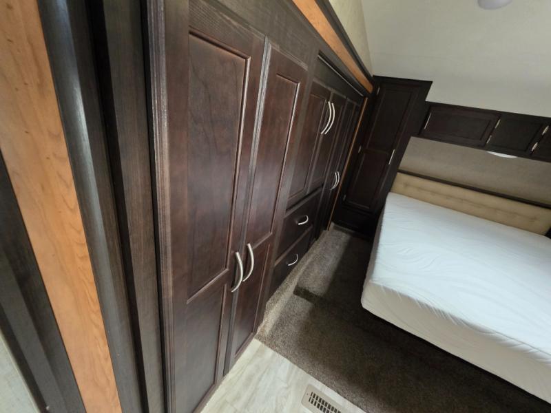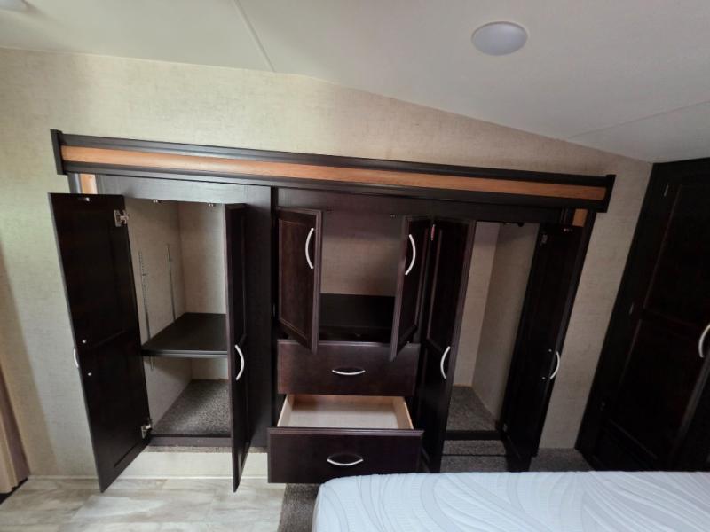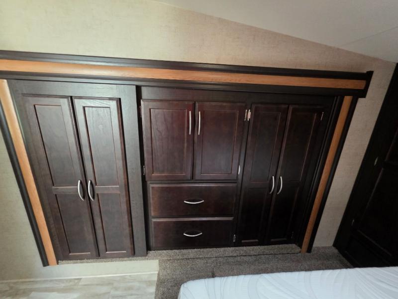 The bedroom has a slide with two closets, and a dresser. On either side of the queen bed you will find a closet, and above the bed there is overhead storage. Across from the bed there is a TV mount.
