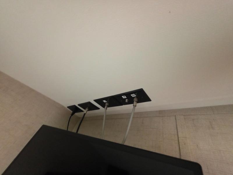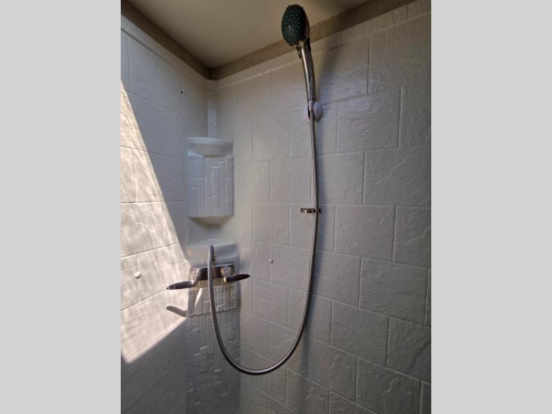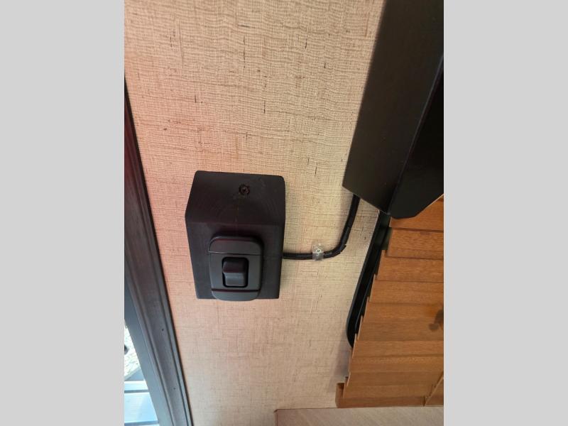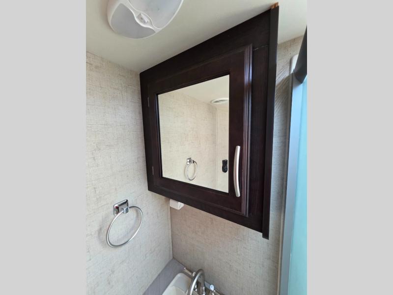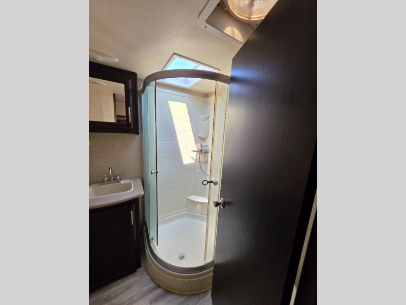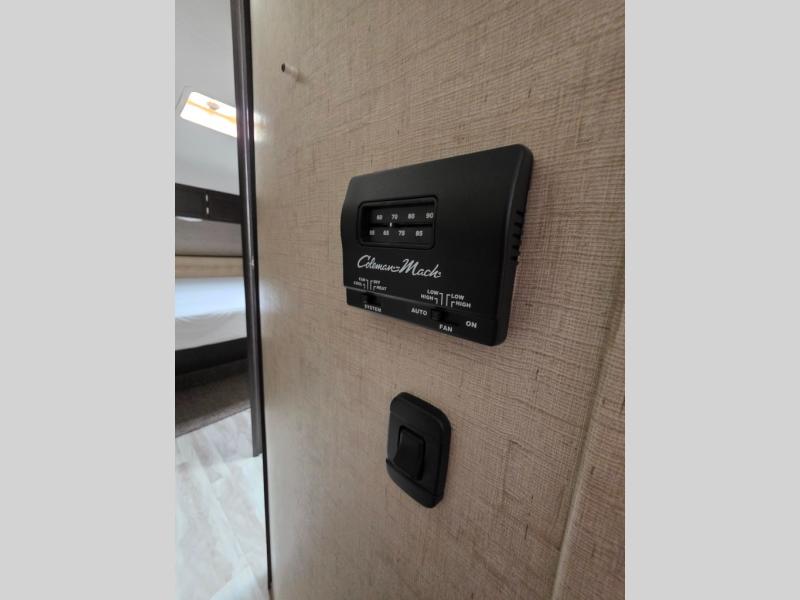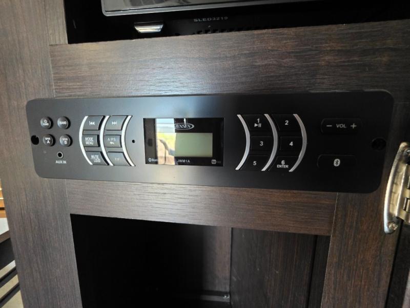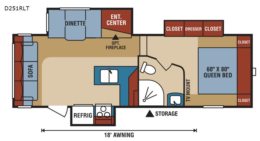 The bedroom has a slide with two closets, and a dresser. On either side of the queen bed you will find a closet, and above the bed there is overhead storage. Across from the bed there is a TV mount.