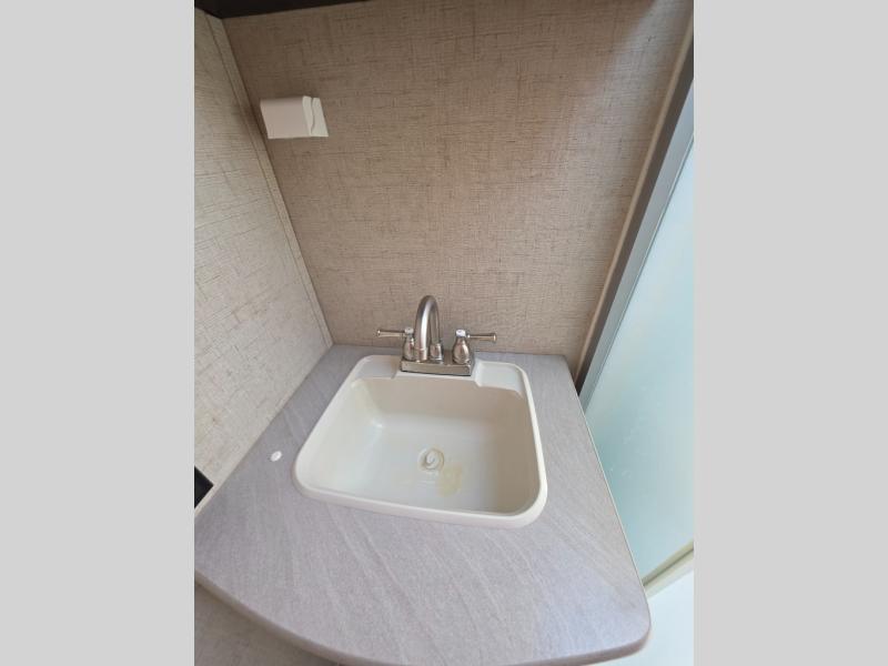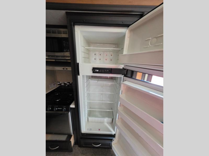 As you enter along the rear wall you will find a sofa with overhead cabinets. The slide out along the road side has a dinette and entertainment center, plus you can choose an optional fireplace as well. The slide out to the right of the entry door offers a refrigerator, three-burner range, and overhead cabinets. There is plenty of counter space with the L-shaped counter for making meals on the go. The kitchen sink is also located on the L-shaped counter, and you will find more overhead cabinets.