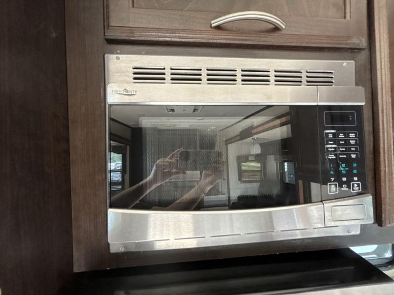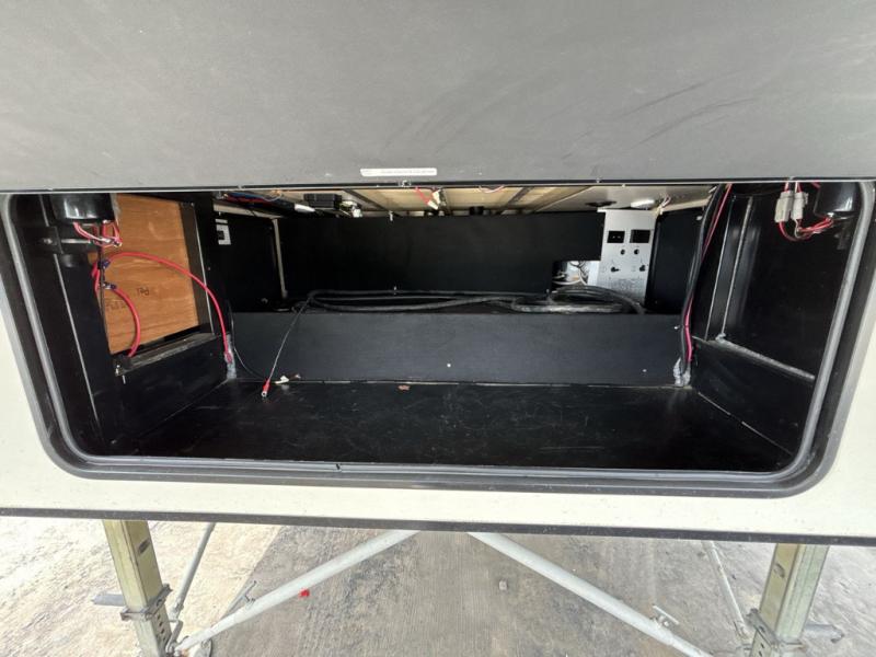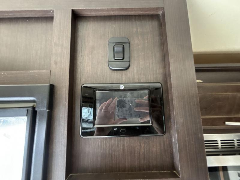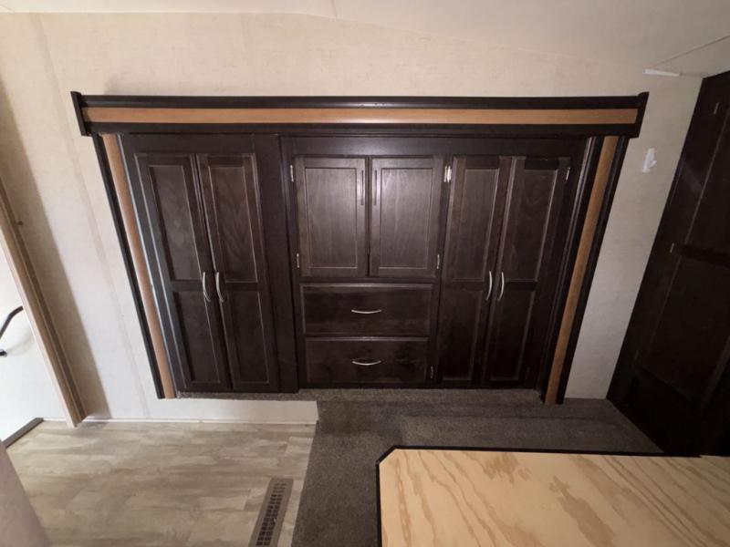 The front bedroom features a slide out with two closets and a dresser. Enjoy a good night's rest on the queen bed. Along either side of the bed there are closets, and an overhead cabinet will come in handy to store books or blankets. Across from the bed there is a TV mount.