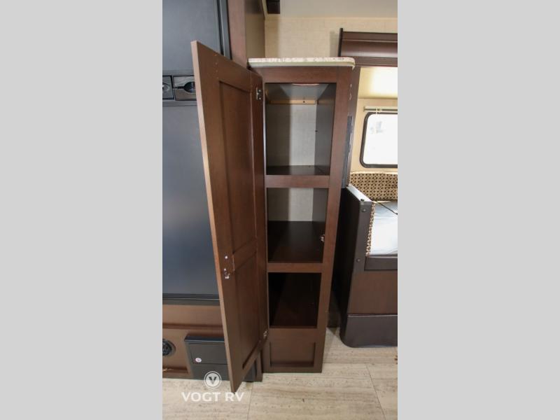 There are plenty of overhead cabinets throughout the inside of the travel trailer, as well as a large exterior pass through storage compartment.