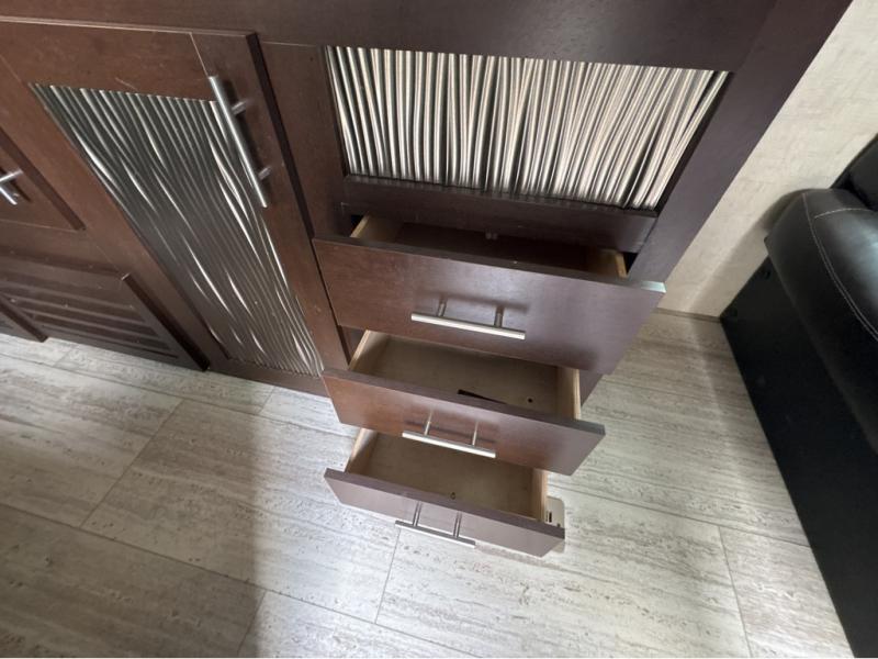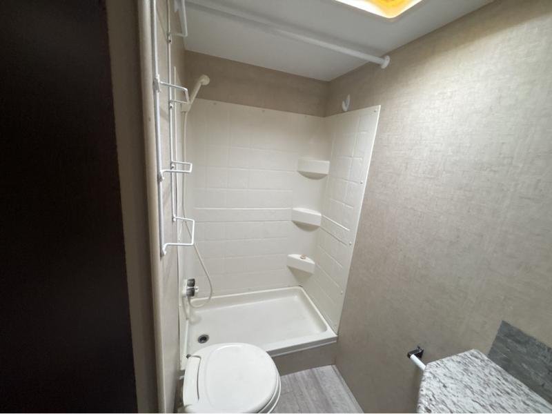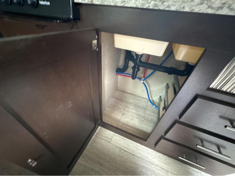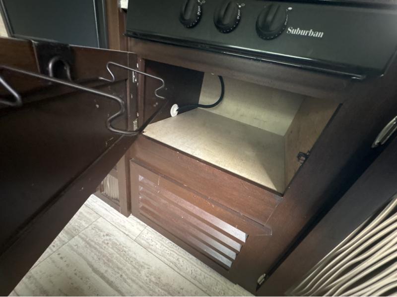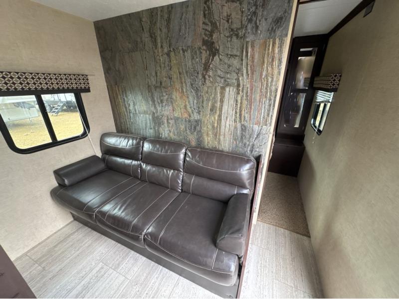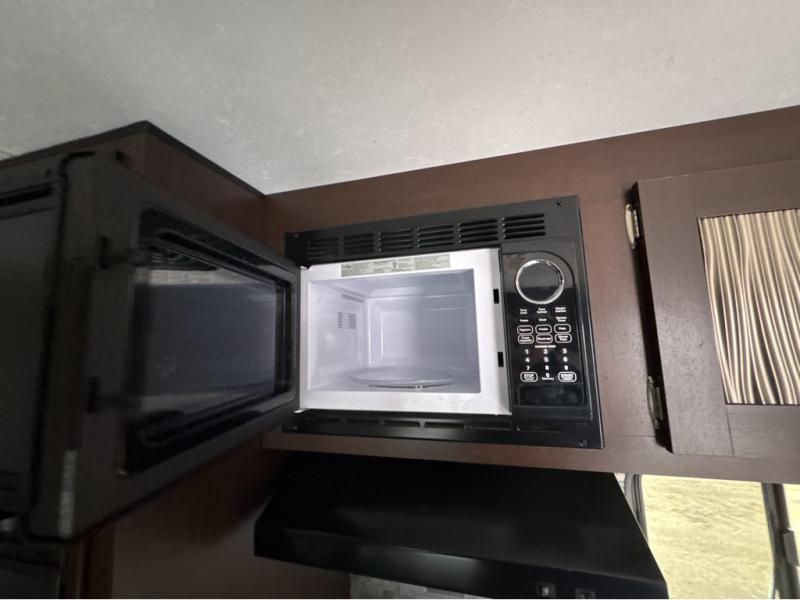 As you enter straight in front of you there is a sofa which faces the rear of the trailer. Along the curb side you can enjoy your meals around the booth dinette. Above the dinette there is a TV mount and overhead cabinets. On the opposite side you will find a double kitchen sink, three burner range, microwave, overhead cabinets, and a refrigerator.