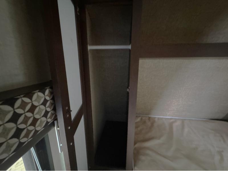 After a day of fun and adventure retreat to the private front bedroom where you will find a queen bed, two wardrobes, and additional overhead storage, plus a TV mount. There is also a privacy door which you can pull to close off the bedroom from the rest of the trailer.