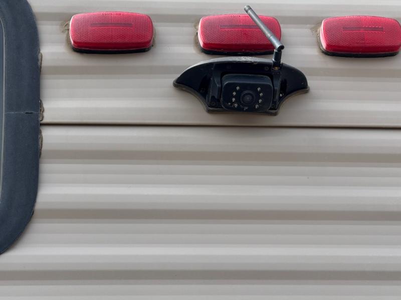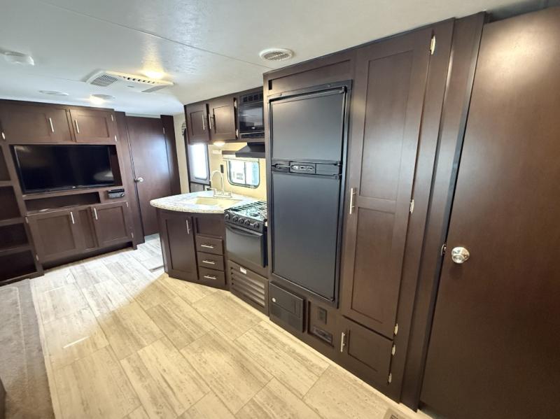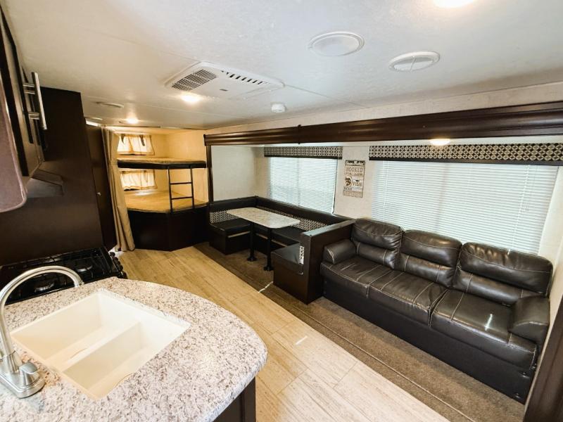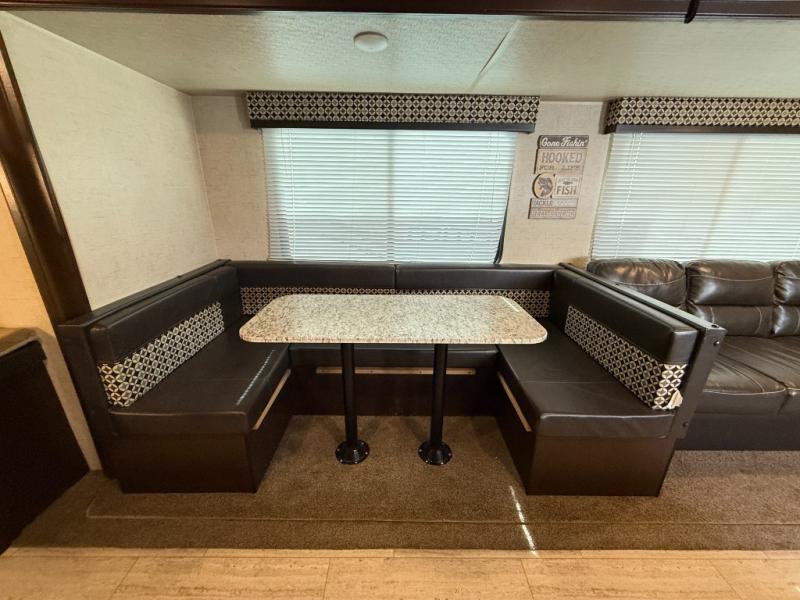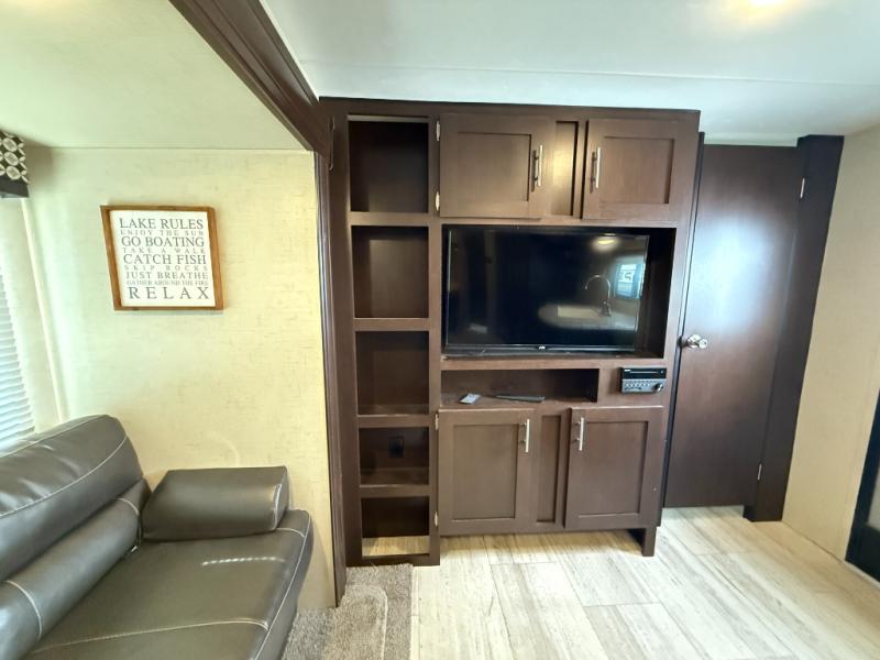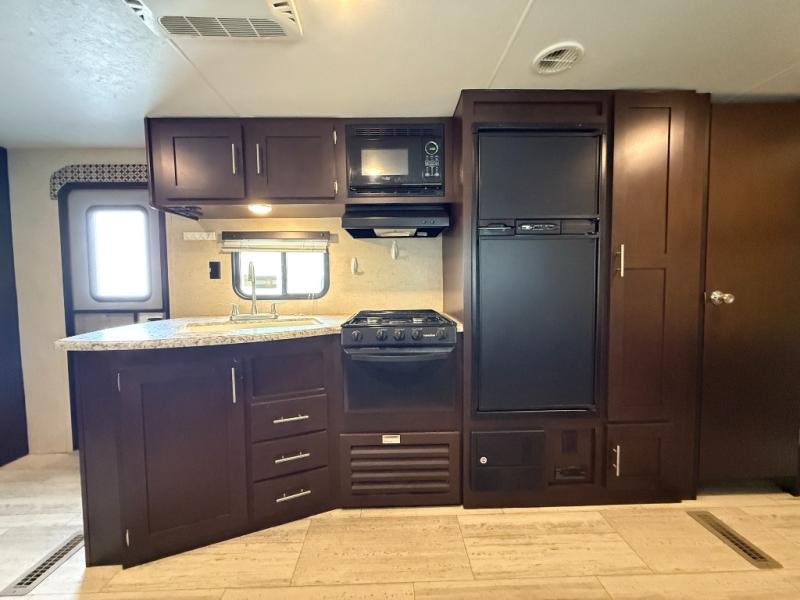 As you enter the travel trailer, to your left there is a double kitchen sink, three burner range, microwave, refrigerator, and a pantry. The opposite side of the travel trailer has a u-dinette and sofa slide providing seating as well as extra sleeping space if needed. You are also sure to enjoy the entertainment center which is located along the front interior wall of the main living area.