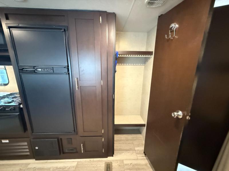 There are plenty of overhead cabinets throughout the travel trailer, as well as a large pass through storage area outside. You may even find the outdoor chef in the family near the outside kitchen including a refrigerator, two burner cooktop, and a sink, plus there is more!