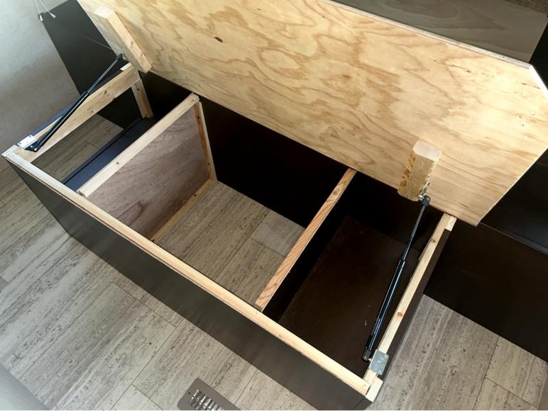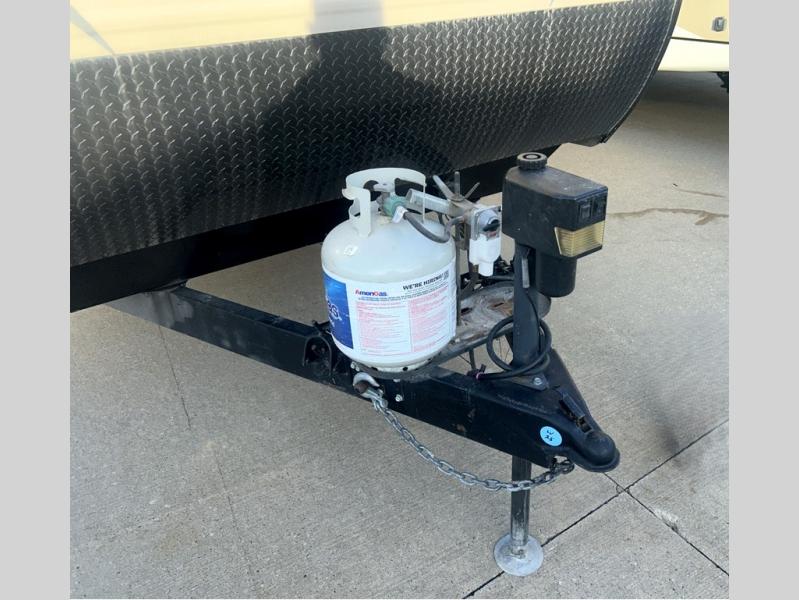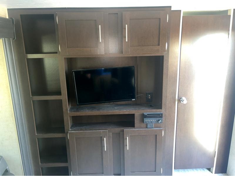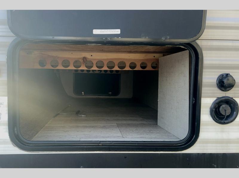 Enjoy all of the storage inside the trailer with the overhead cabinets, as well as the exterior pass through storage area near the front, and the trunk door along the road side.