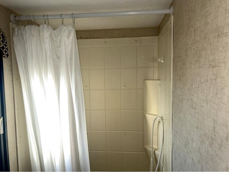 As you proceed towards the rear of the trailer there is a closet on your left just before the bathroom in the rear corner. Inside the bathroom there is a toilet, sink, medicine cabinet, and a shower. Plus you will find the second entrance into the trailer. Now that's convenient!